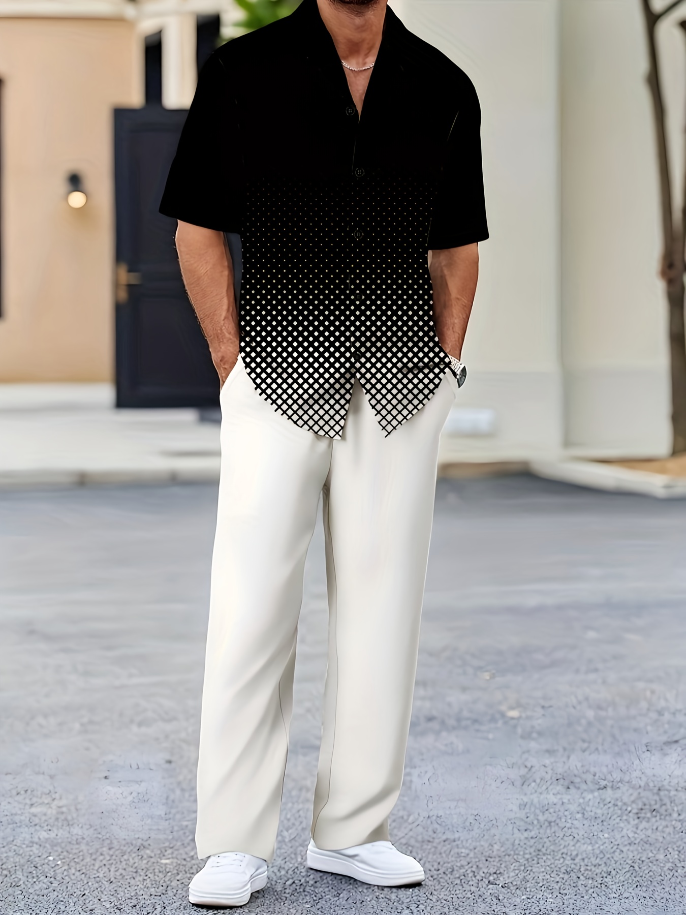 Men's Casual Black & White Color Matching Gradient Printed Short Sleeved Shirt & Trousers Two Piece Set
