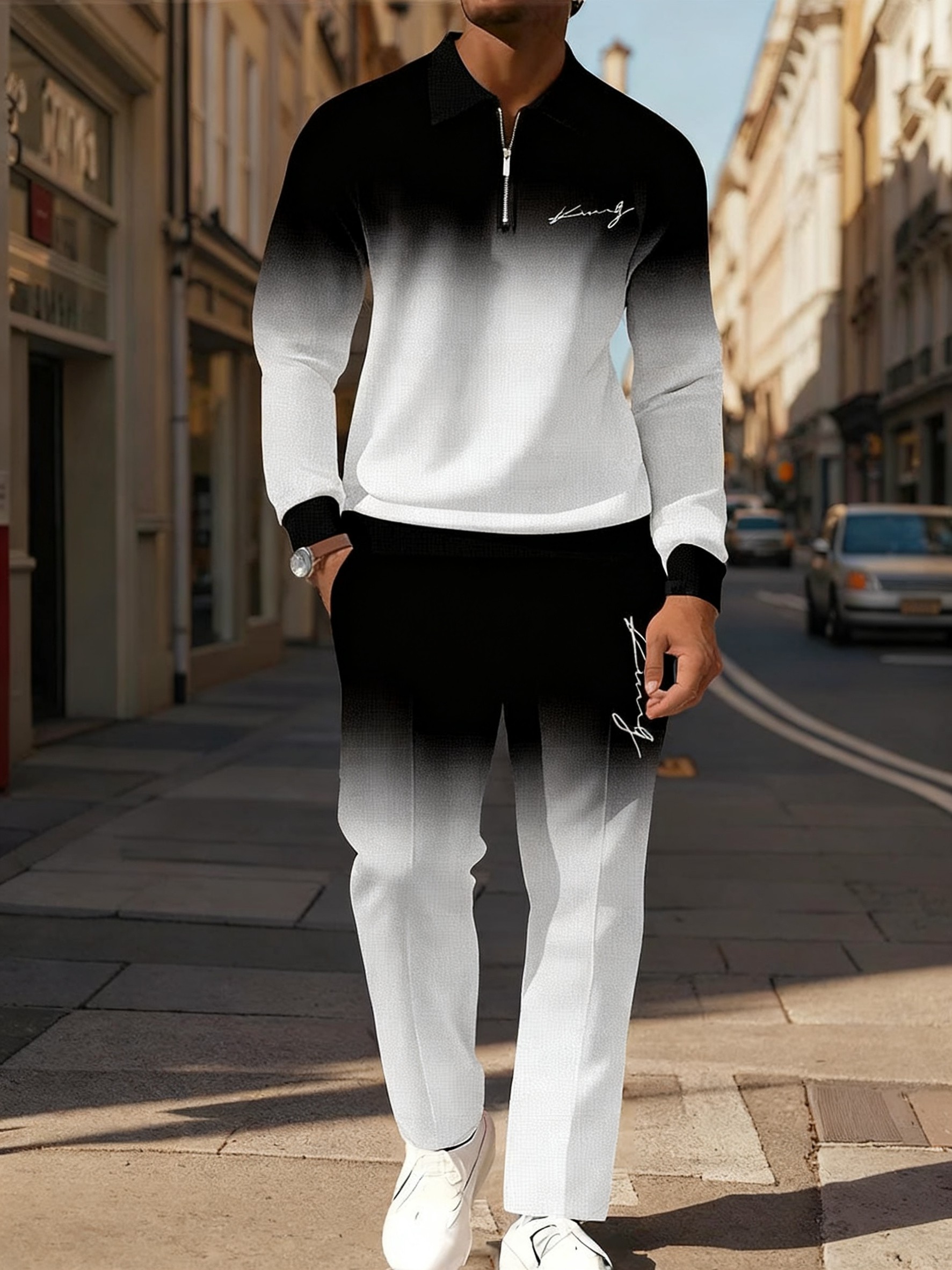 Men's Casual Black & White Gradient Color Matching Printed Polo-Collar Zipper Long Sleeved Trousers Two-Piece Set