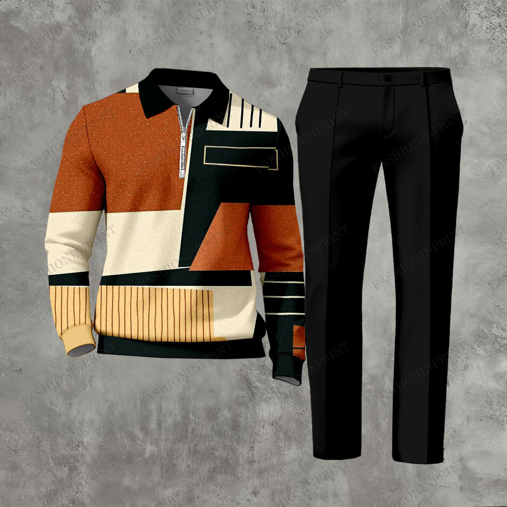 Men's Casual Black & Yellow Color Matching Geoemtric Printed Zipper Long Sleeved Polo Shirt & Trousers Two-Piece Set