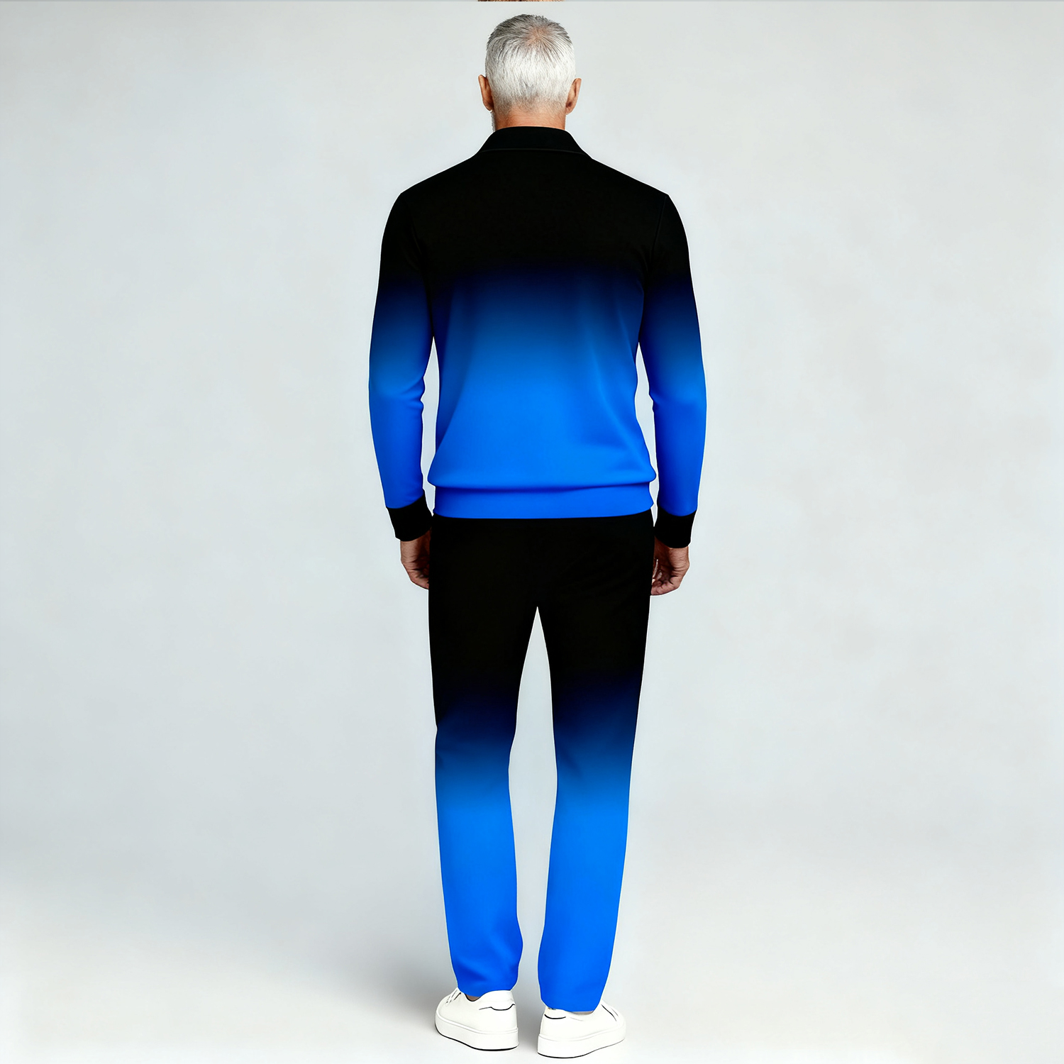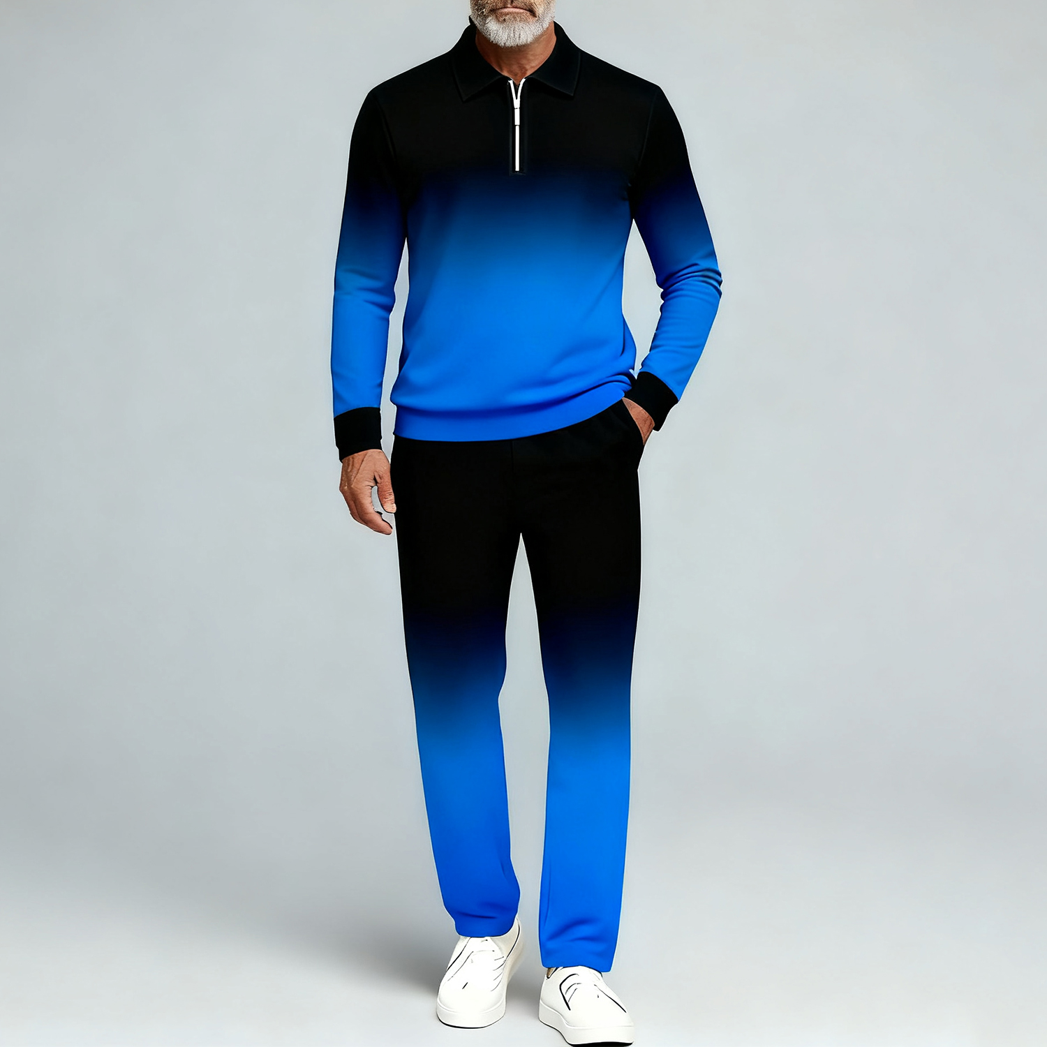 Men's Casual Blue&Black Gradient Color Matching Printed Polo-Collar Zipper Long Sleeved Trousers Two-Piece Set
