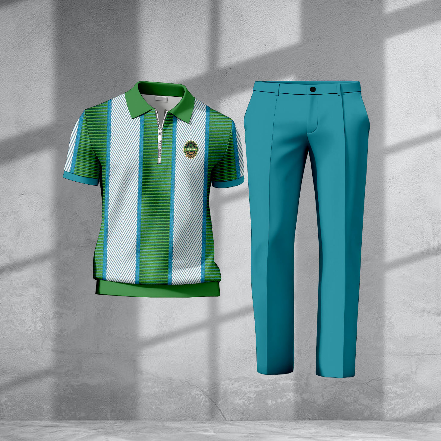 St. Patrick's Day Men's Casual Blue & Green Color Matching Geometric Printed Short Sleeved Polo Shirt & Trousers Two-Piece Set