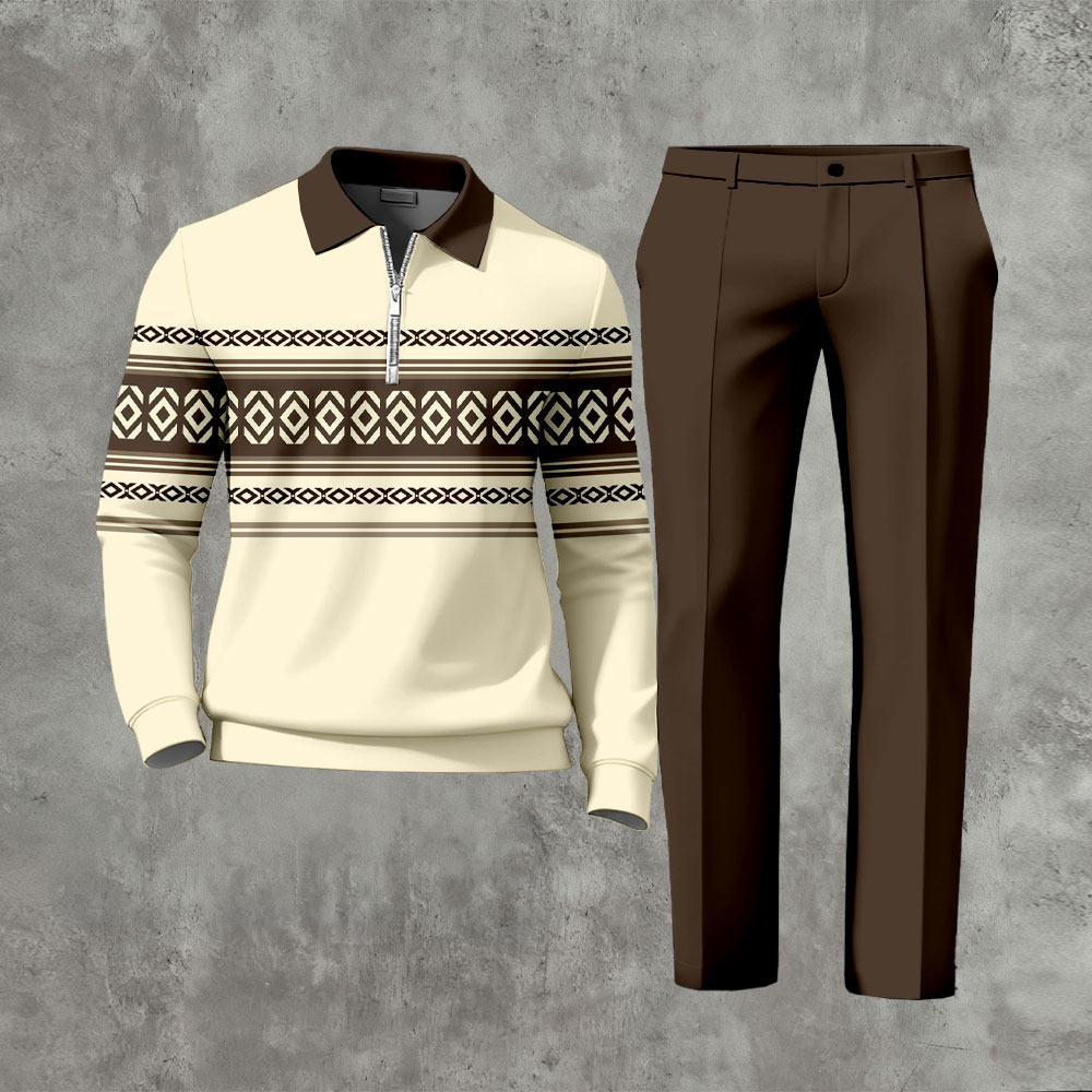 Men's Casual Brown & Apricot Color Matching Vintage Partten Polo-Collar Zipper Long Sleeved Trousers Two-Piece Set