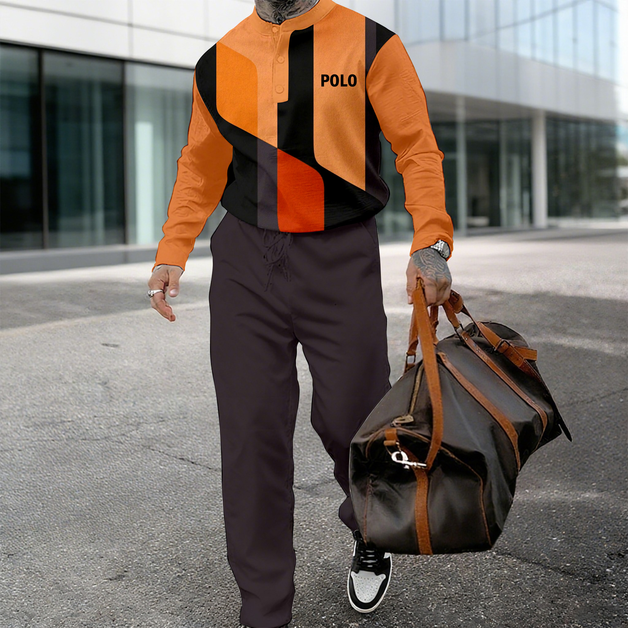 Men's Casual Color-Block Printed Small Stand Collar Long Sleeve Pants Two-Piece Set