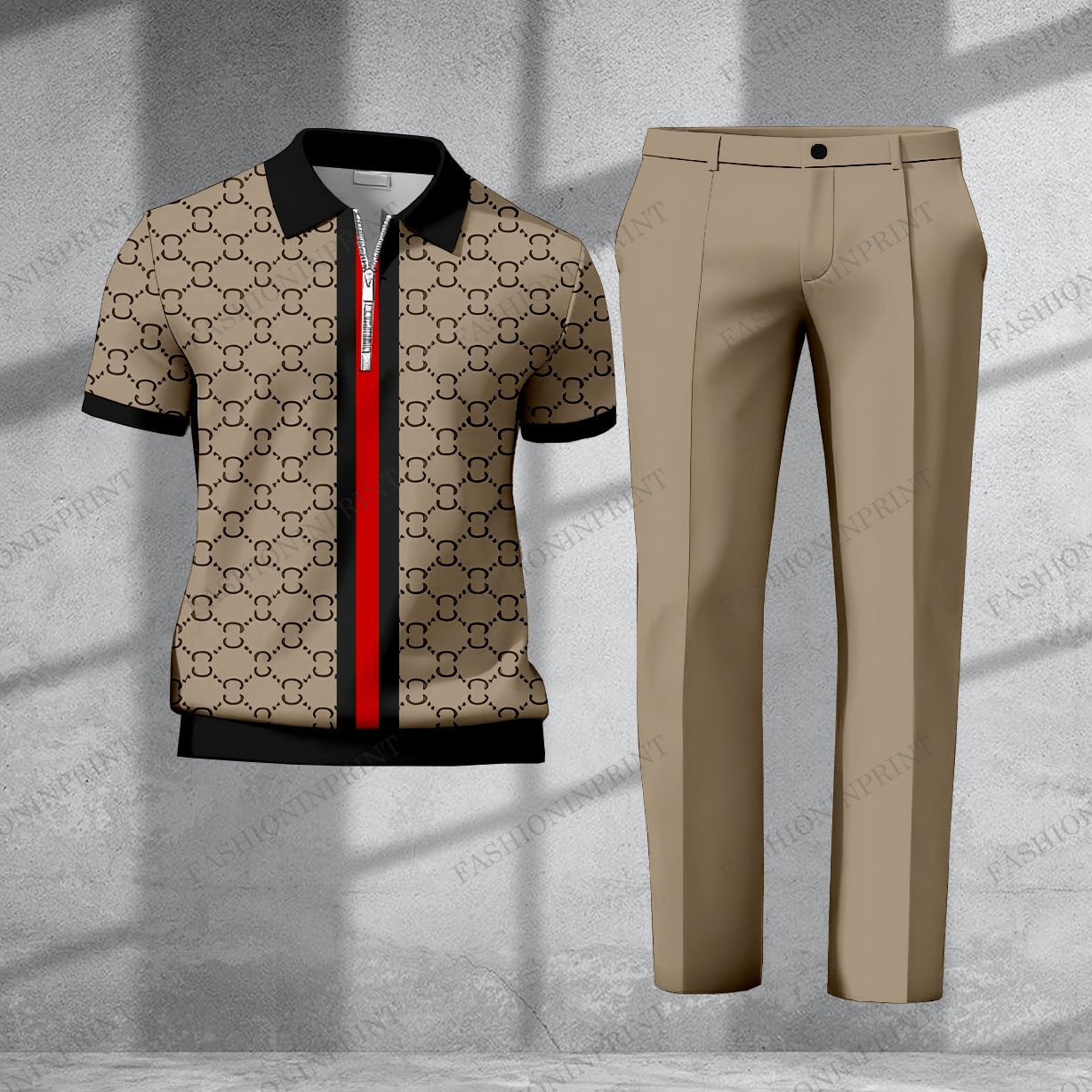 Men's Casual Tan & Black Color Matching Retro Style Printed Short Sleeved Polo Shirt & Trousers Two-Piece Set