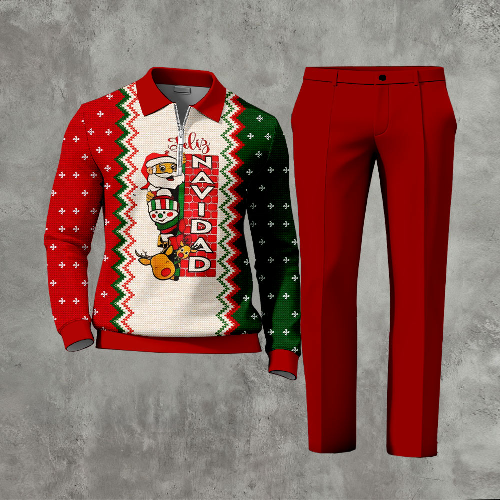 Men's Casual Red Green And Beige Color Matching Christmas Printed Zipper Long Sleeved Polo Shirt & Trousers Two-Piece Set