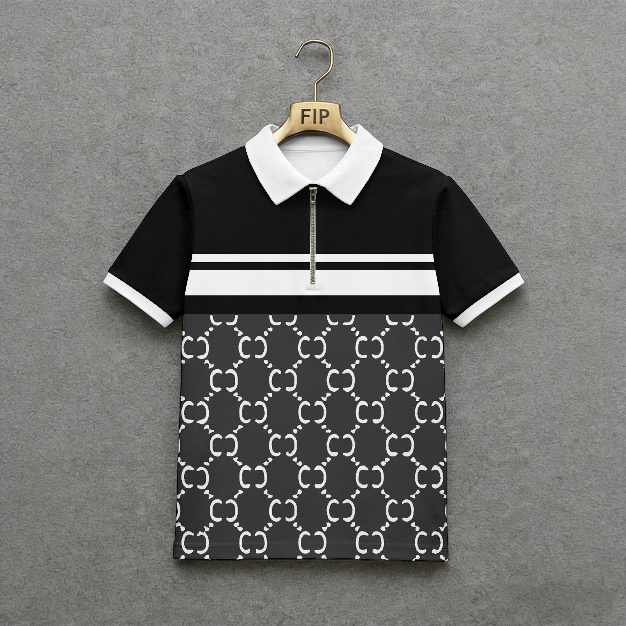 Men's Casual Black & White Color Matching Vintage Style Print Short-Sleeve Polo Shirt