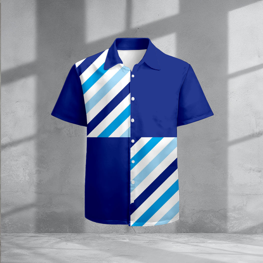 Men's Casual Blue & White Color Matching Geometric Print Short-Sleeve Shirt