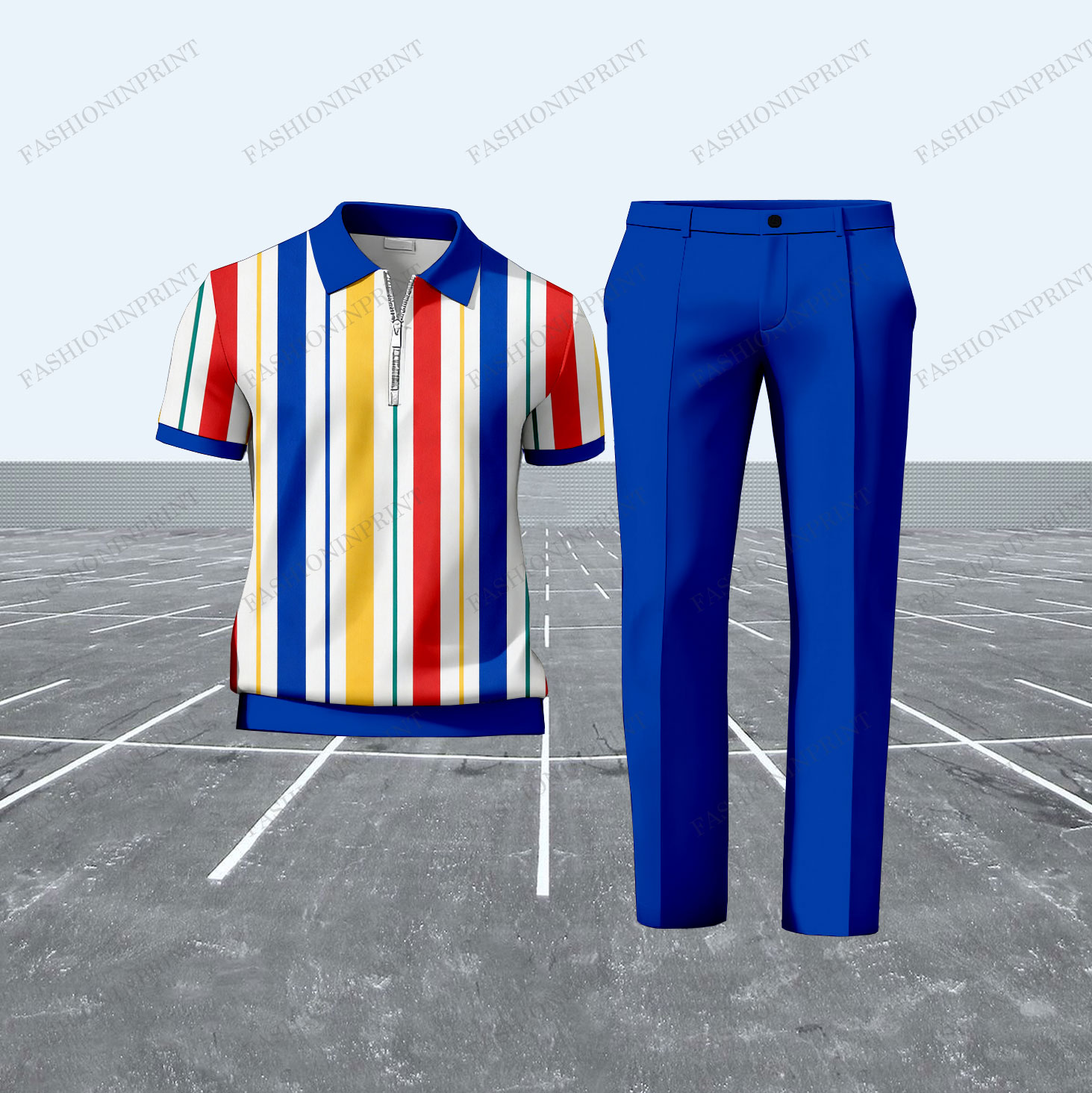Men's Casual Color Matching Vertical Stripes Printed Short Sleeved Polo Shirt & Trousers Two-Piece Set