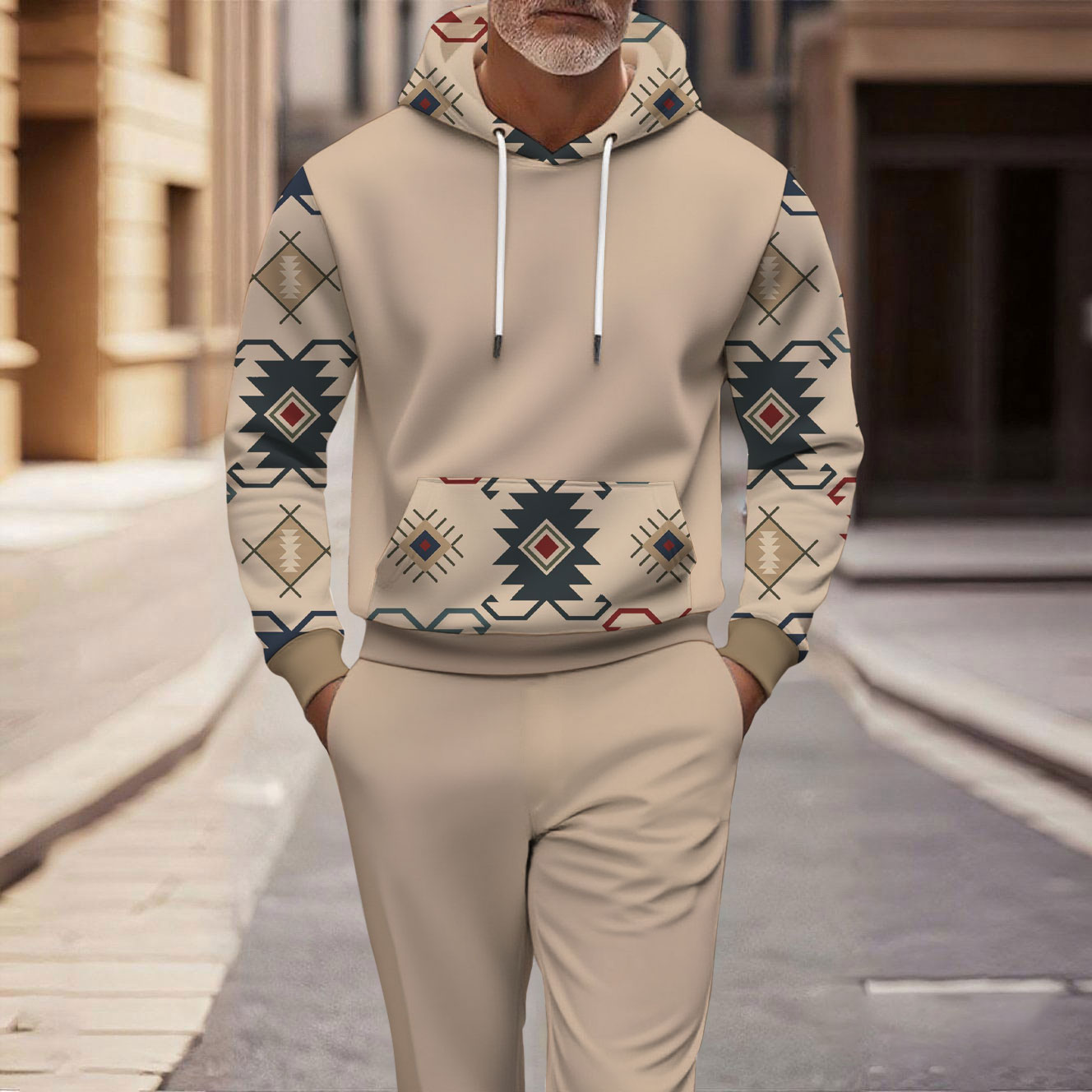 Men's Casual Color Matching Printed Long-Sleeved Hoodies Sweatshirt & Trousers Two-Piece Set