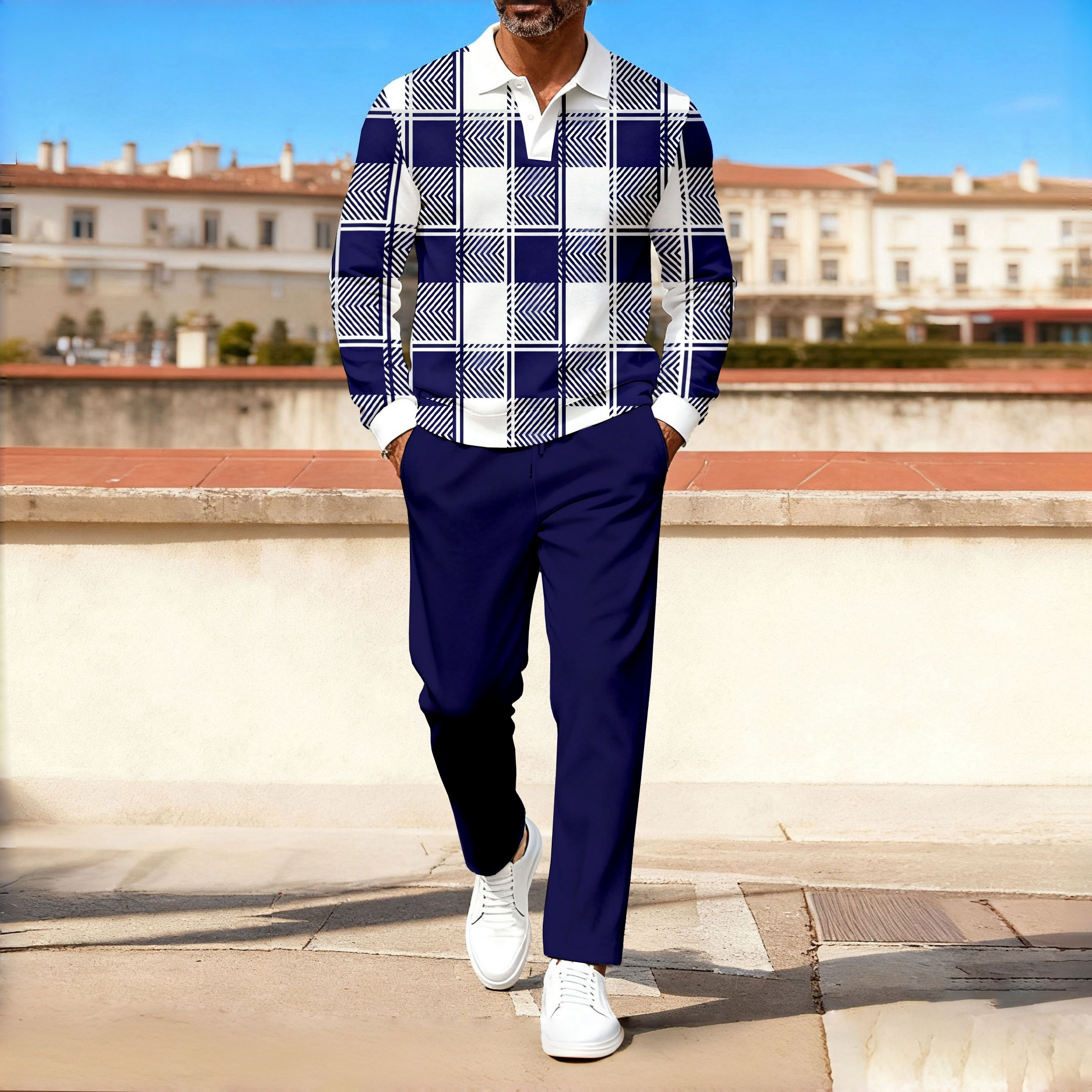 Men's Casual Royal Blue & White Color Matching Checked Printed Polo-Collar Long Sleeved Trousers Two-Piece Set
