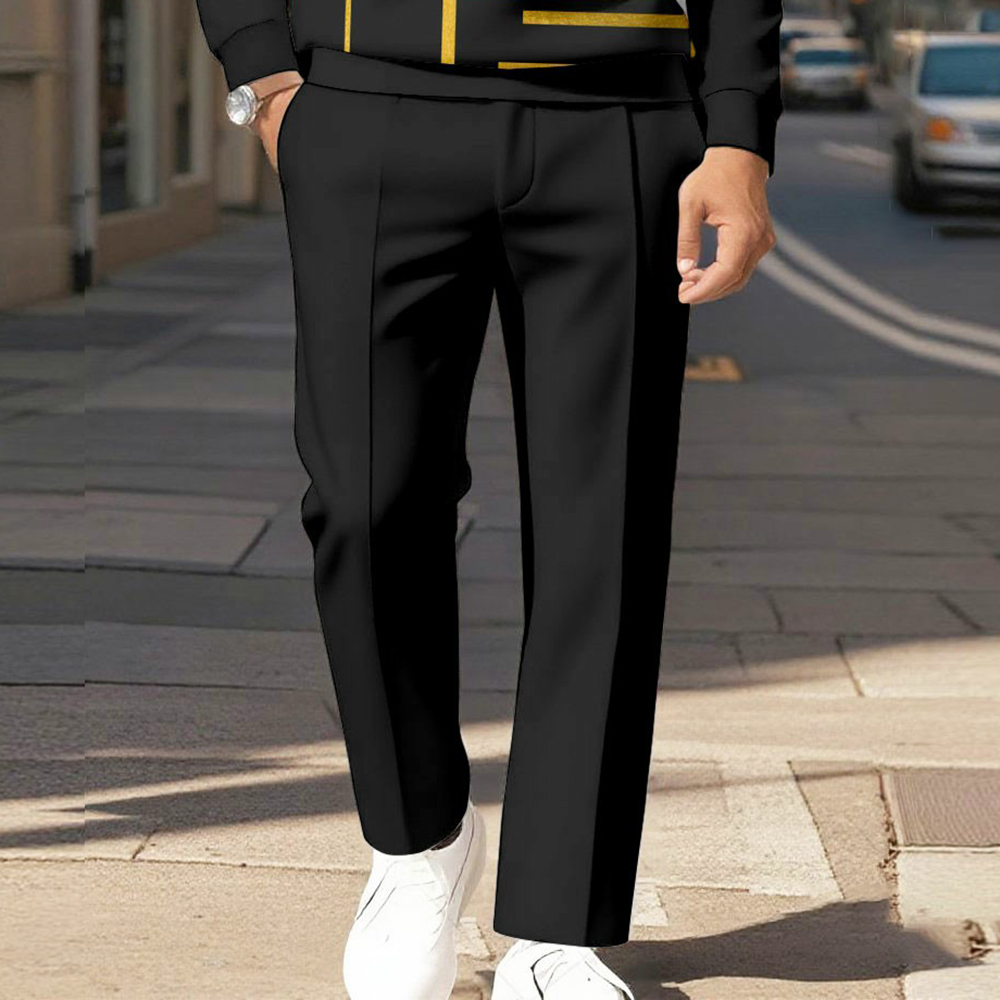 Men's Casual Black Color Matching Geometric Printed Polo-Collar Zipper Long Sleeved Trousers Two-Piece Set