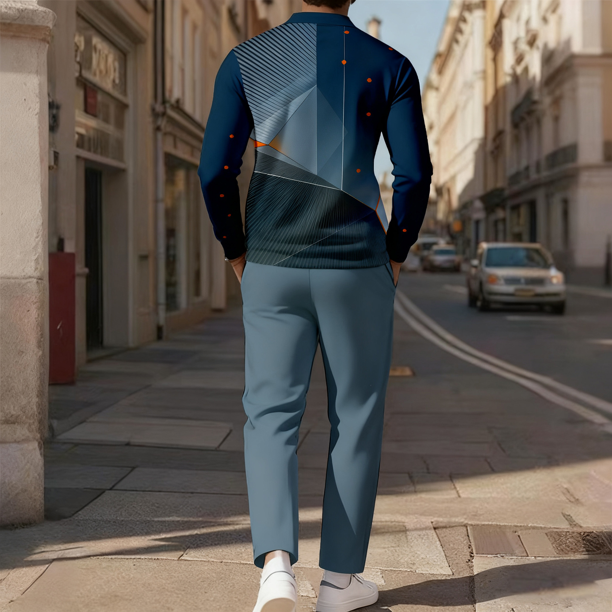 Men's Casual Color Matching Printed Polo-Collar Zipper Long Sleeved Trousers Two-Piece Set