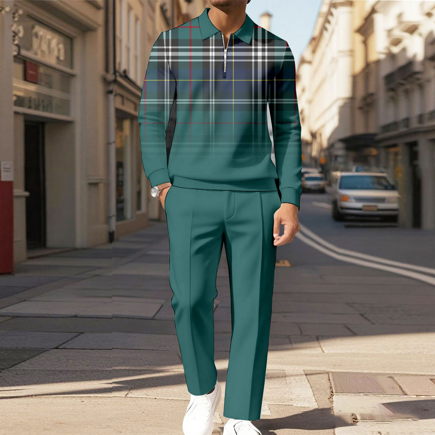 Men's Casual Color Matching Printed Polo-Collar Zipper Long Sleeved Trousers Two-Piece Set