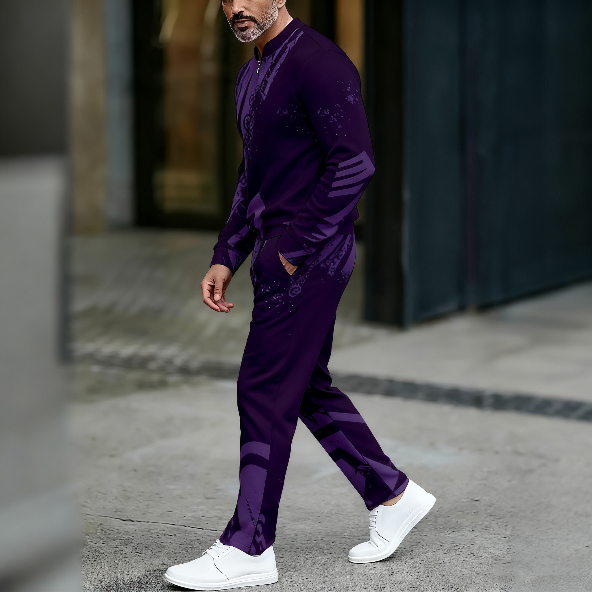 Men's Casual Color Matching Printed Round-Neck Zipper Long Sleeved Trousers Two-Piece Set