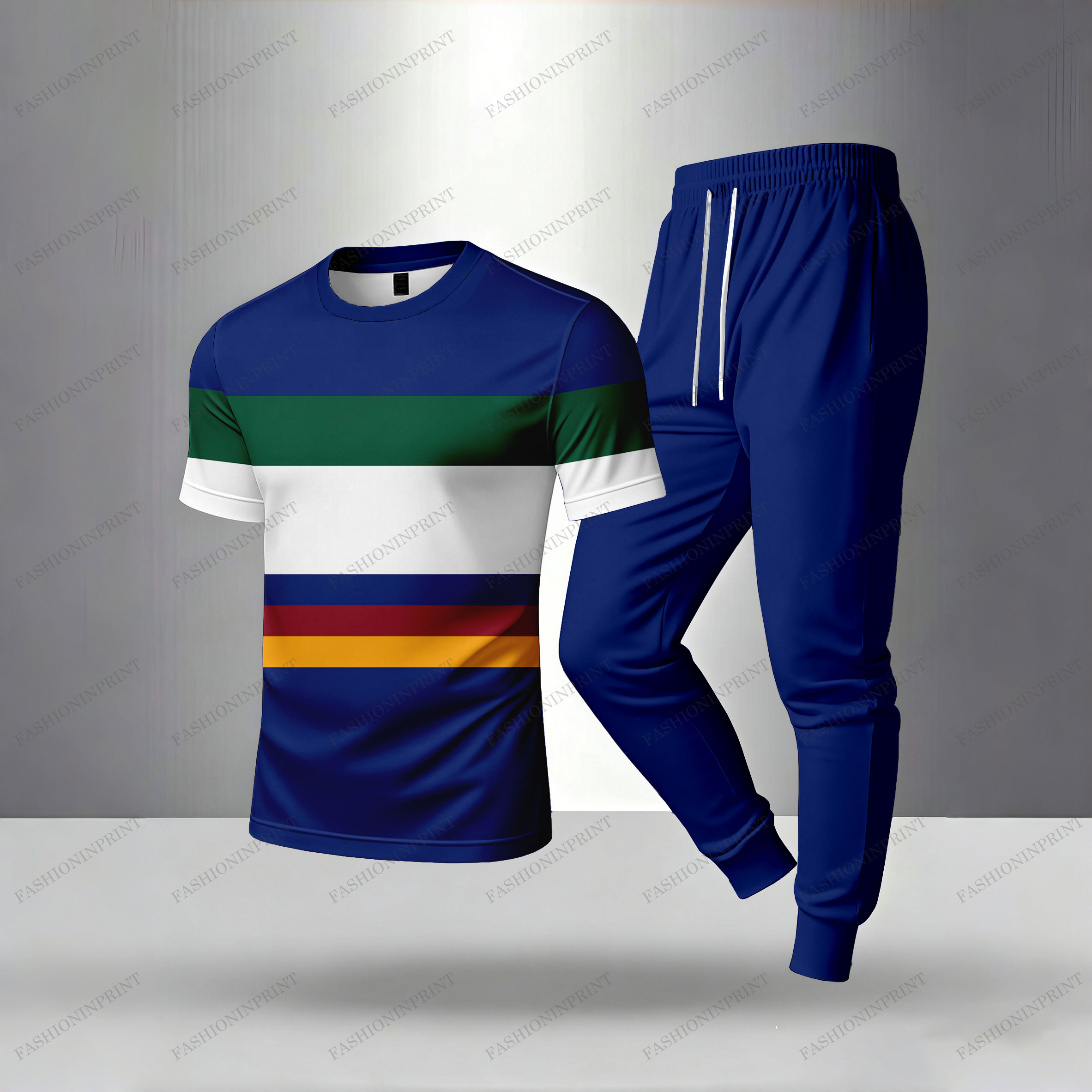 Men's Casual Royal Blue & Multi Color Matching Striped Printed Short Sleeved T-shirt & Trousers Two-Piece Set