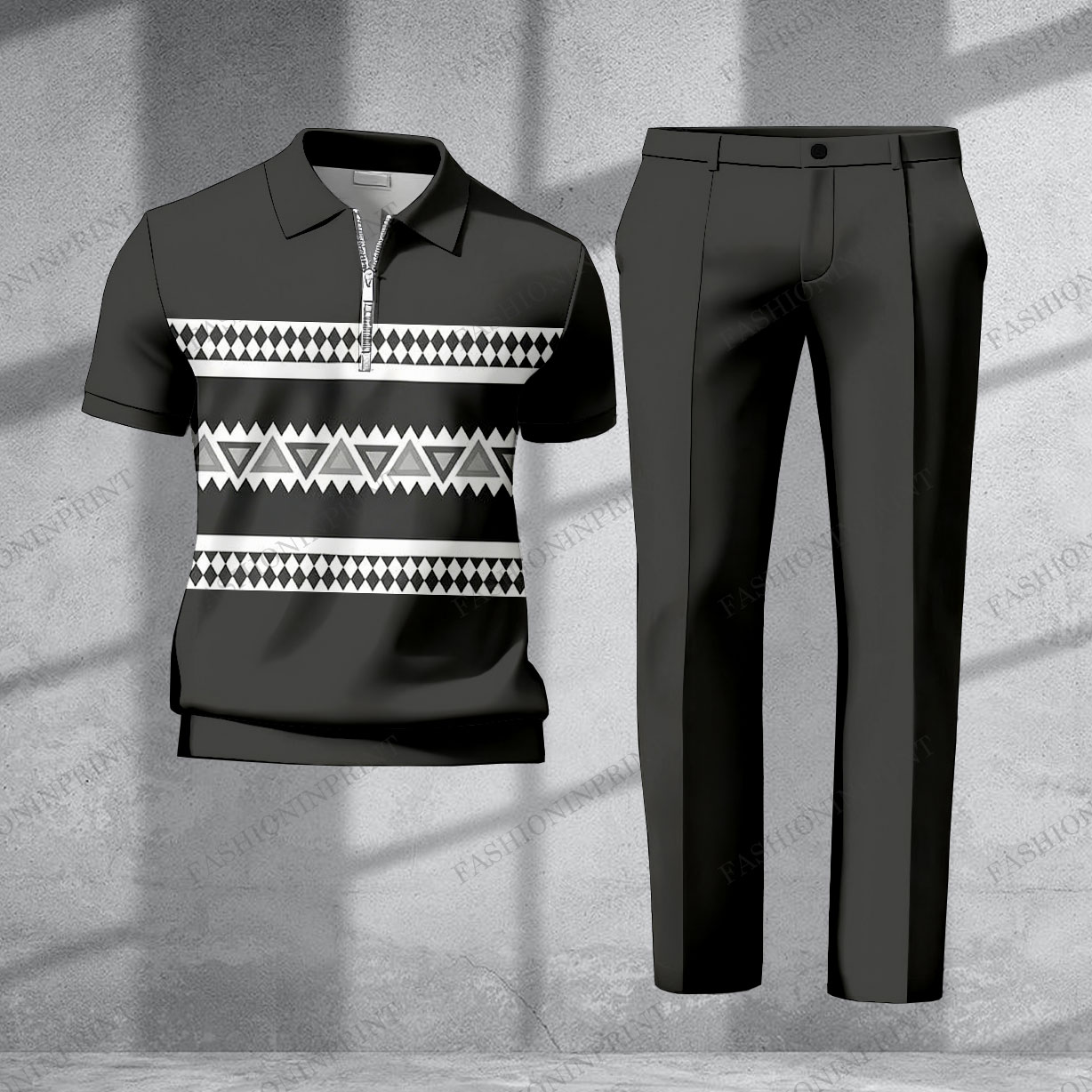 Men's Casual Color Matching Printed Short Sleeved Polo Shirt & Trousers Two-Piece Set