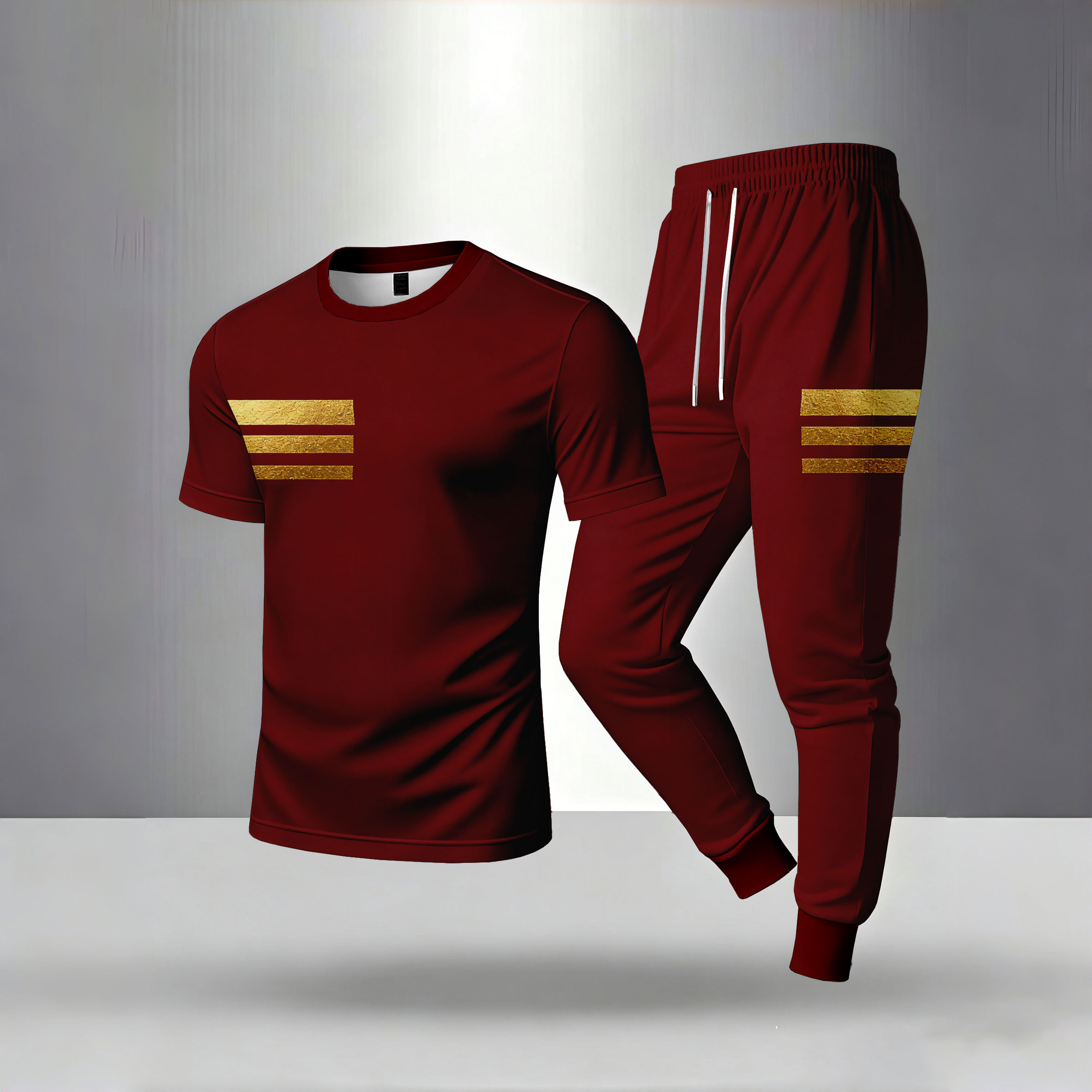 Men's Casual Deep Red & Yellow Color Matching Striped Printed Short Sleeved T-Shirt & Trousers Two-Piece Set
