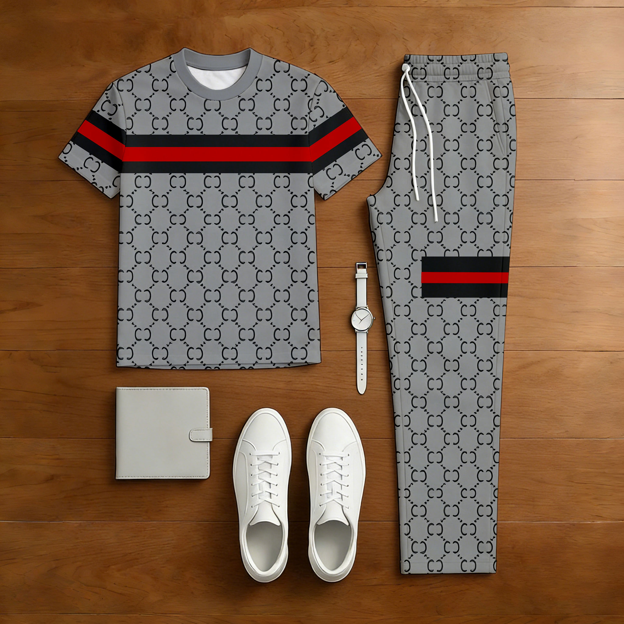 Men's Casual Gray & Black & Red Color Matching Vintage Printed Short Sleeved T-Shirt & Trousers Two-Piece Set