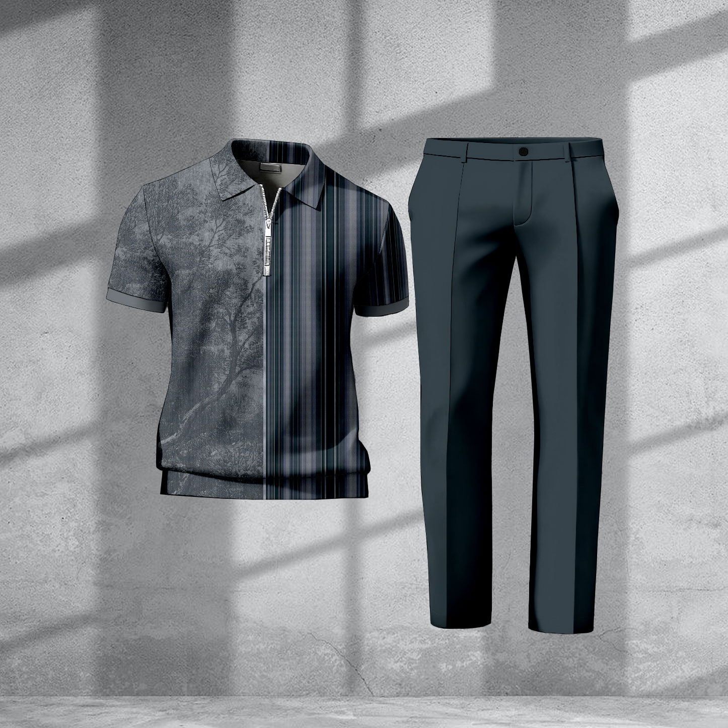 Men's Casual Dark Gray & Dark Navy Color Matching Asymmreic Printed Short Sleeved Zipper Polo Shirt & Trousers Two-Piece Set