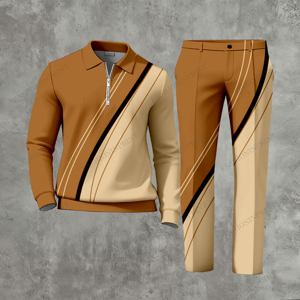 Men's Casual Yellow & Orange Color Matching Printed Zipper Long Sleeved Polo Shirt & Trousers Two-Piece Set