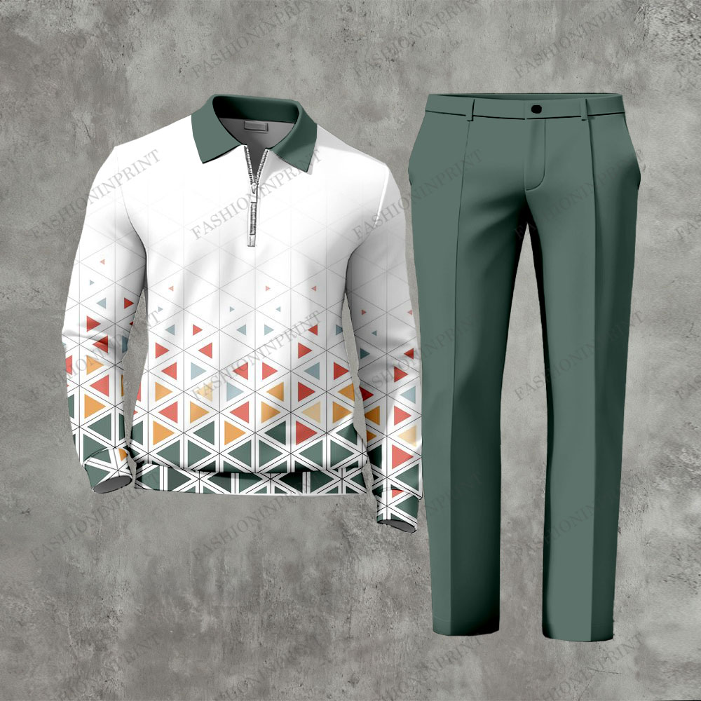 Men's Casual Green & Multi Color Matching Geometric Printed Zipper Long Sleeved Polo Shirt & Trousers Two-Piece Set