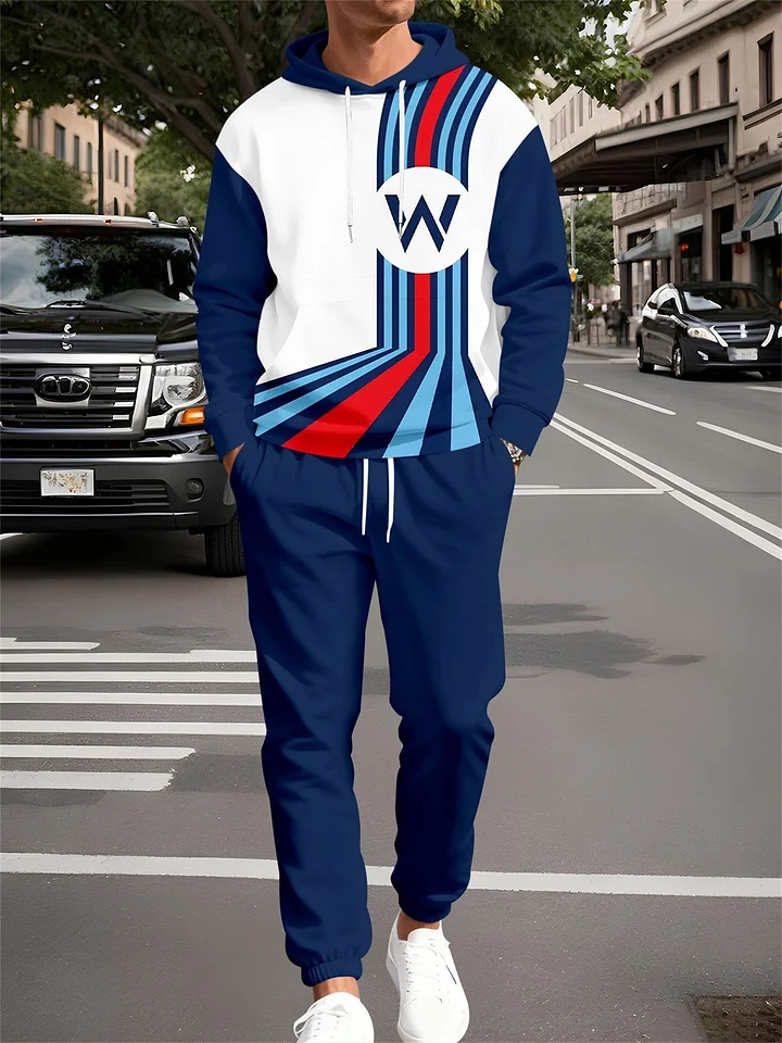 Men's Casual Color Matching "W" Striped Printed Hoodies Long Sleeved Trousers Navy Blue Two-Piece Set