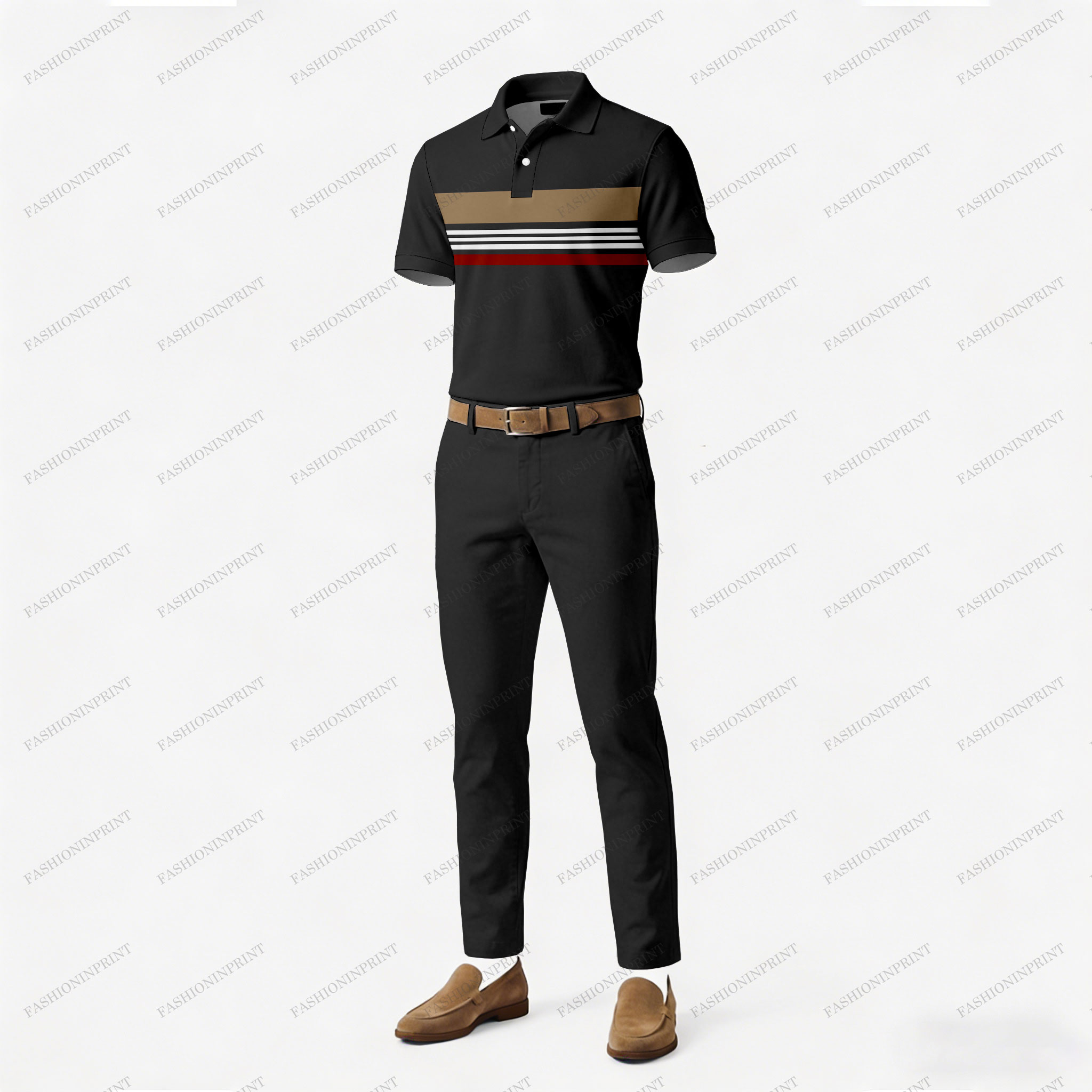 Men's Casual Dark Gray & Tan Color Matching Striped Printed Short Sleeved Polo Shirt & Trousers Two-Piece Set