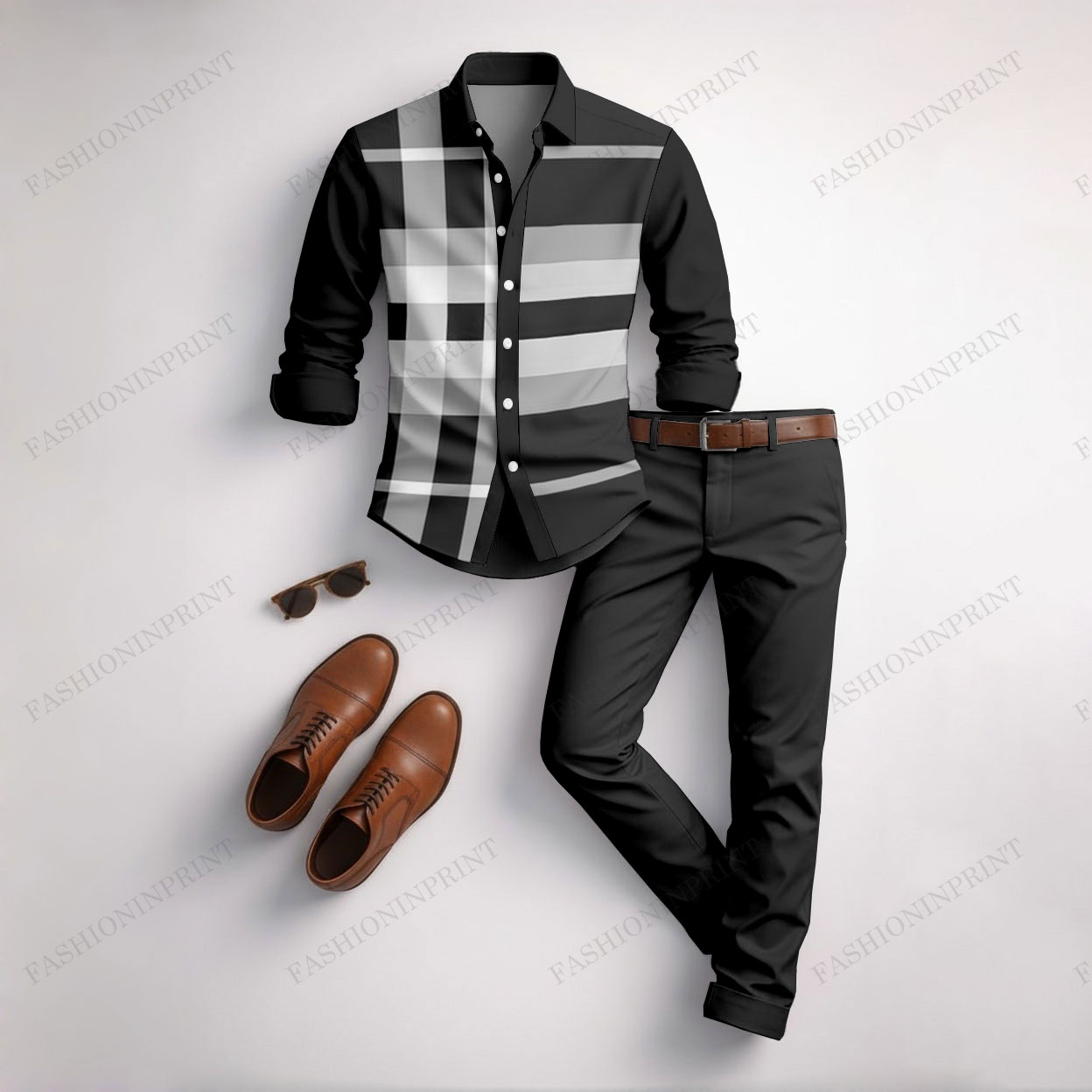 Men's Casual Dark Gray & White Color Matching Checkered Printed Long Sleeved Shirt & Trousers Two-Piece Set