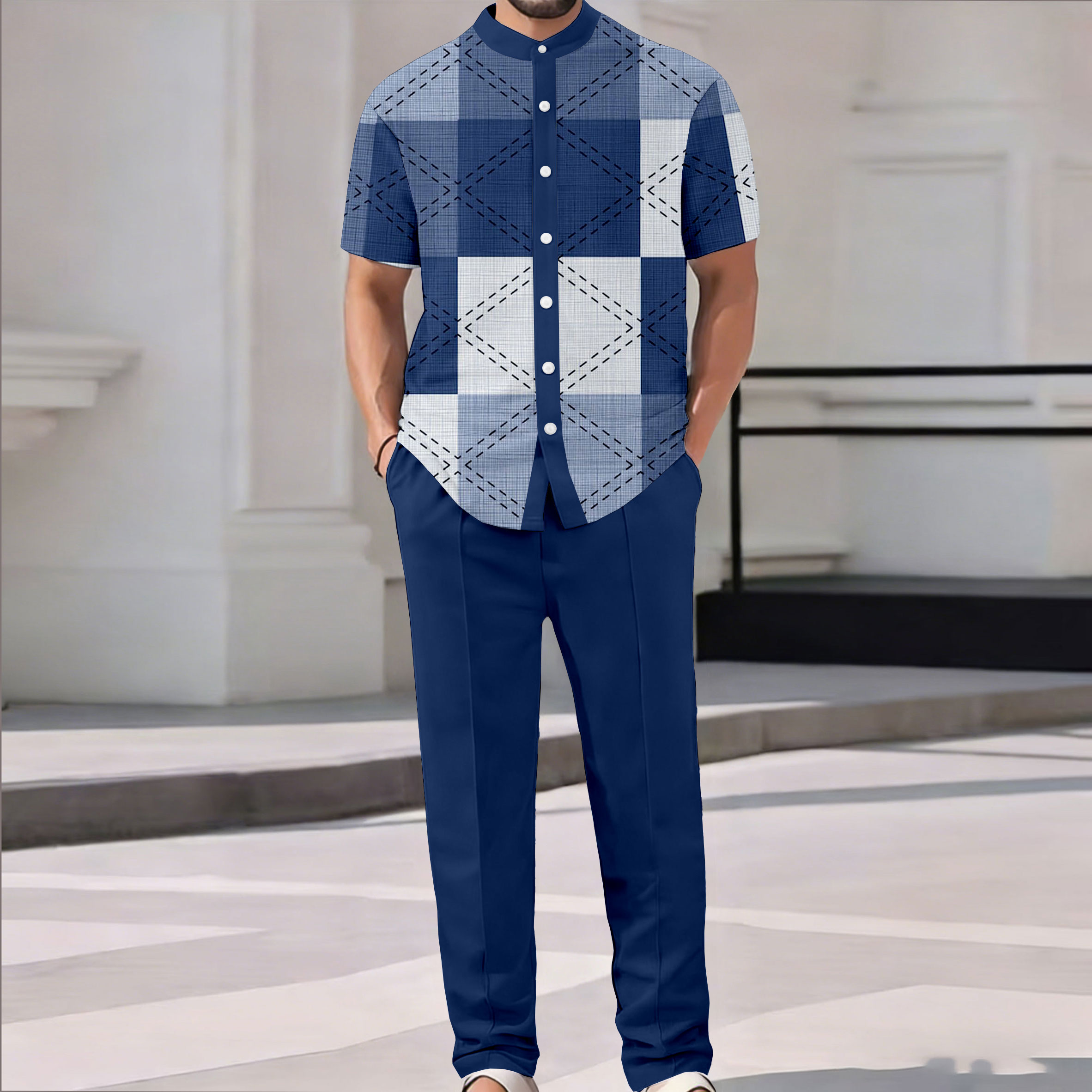 Men's Casual Denim Blue Color Matching Checkered Printed Short Sleeved Shirt & Trousers Two-Piece Set