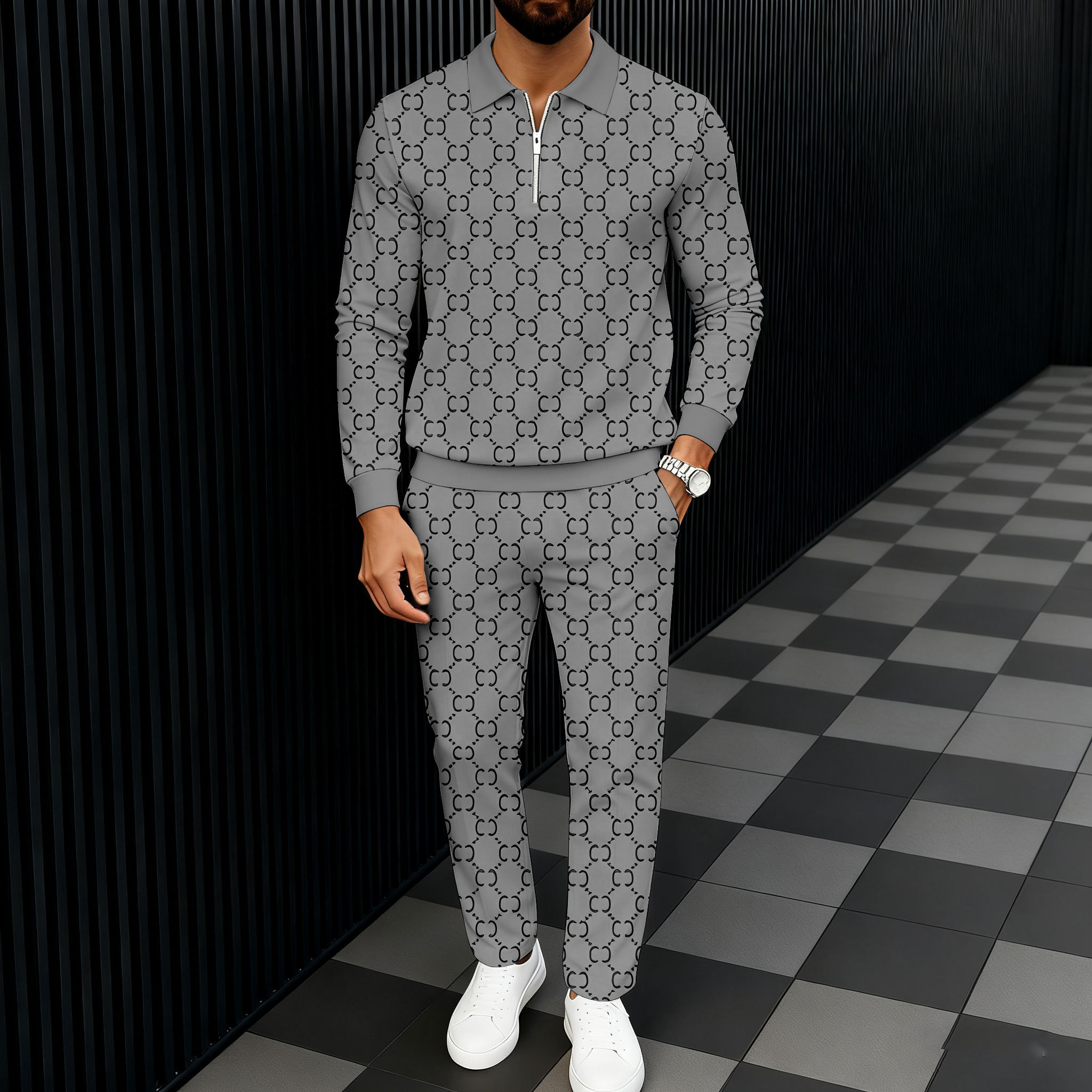 Men's Casual Gray Color All-over Print Polo-Collar Zipper Long Sleeved Trousers Two-Piece Set