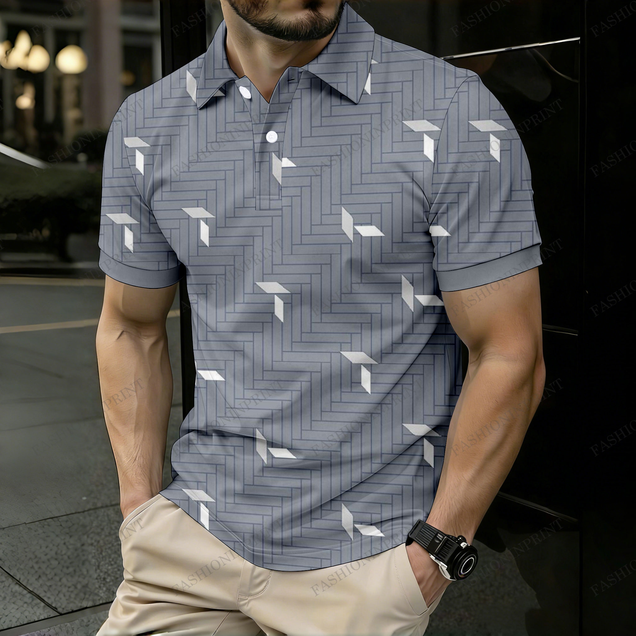 Men's Casual Gray Color Matching Checkered Printed Short Sleeved Polo Shirt