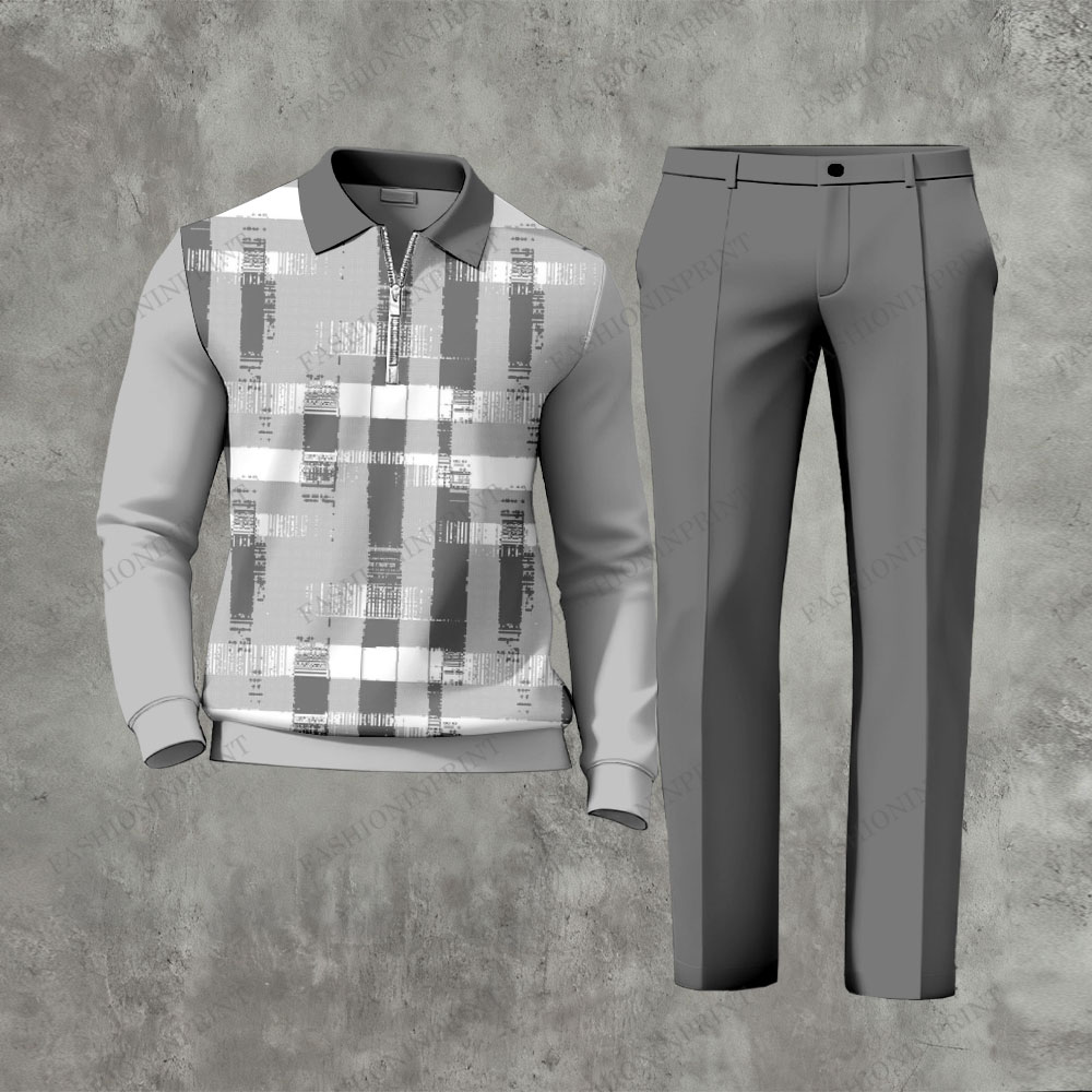 Men's Casual Gray Color Matching Chekered Printed Zipper Long Sleeved Polo Shirt & Trousers Two-Piece Set