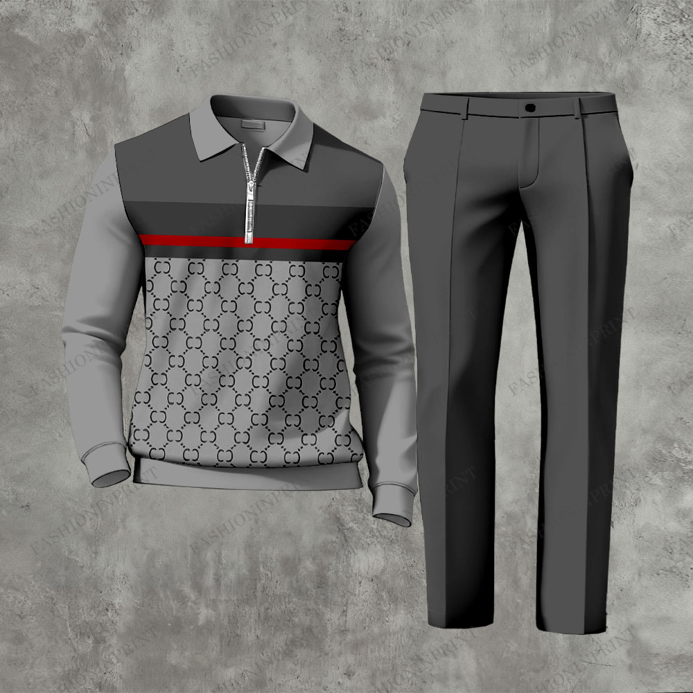 Men's Casual Gray Color Matching Retro Style Printed Zipper Long Sleeved Polo Shirt & Trousers Two-Piece Set