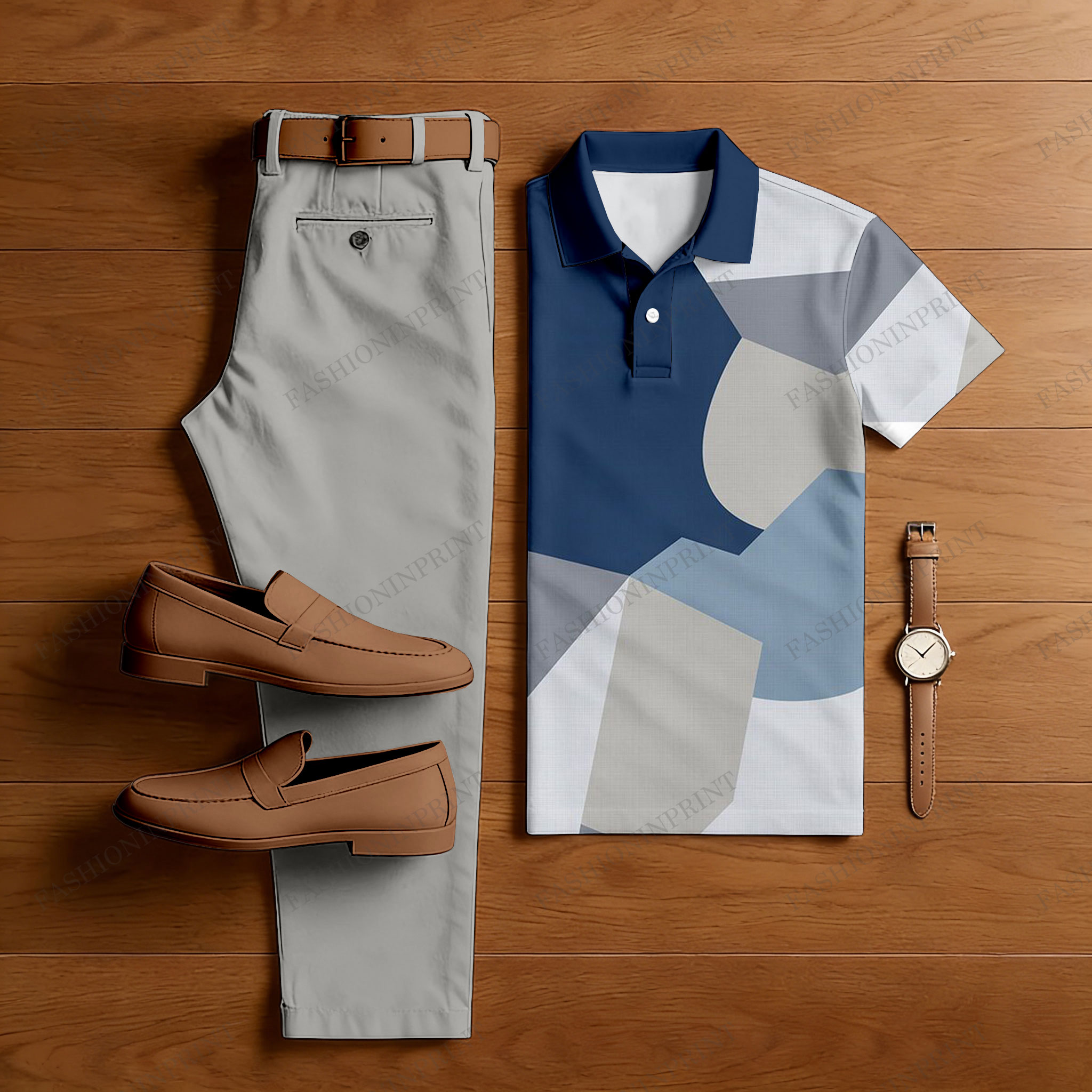 Men's Casual Gray & Navy Color Matching Geometric Printed Short Sleeved Polo Shirt & Trousers Two-Piece Set