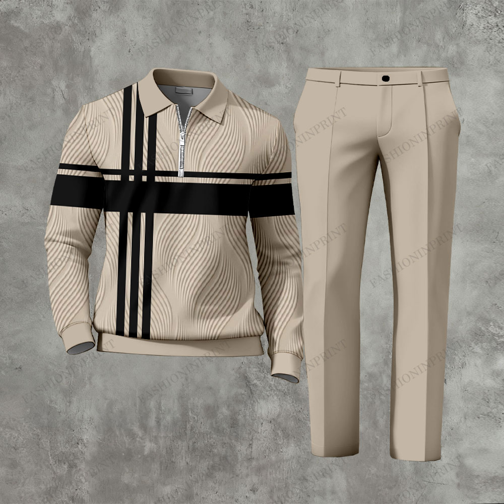 Men's Casual Khaki & Black Color Matching Geometric Printed Zipper Long Sleeved Polo Shirt & Trousers Two-Piece Set