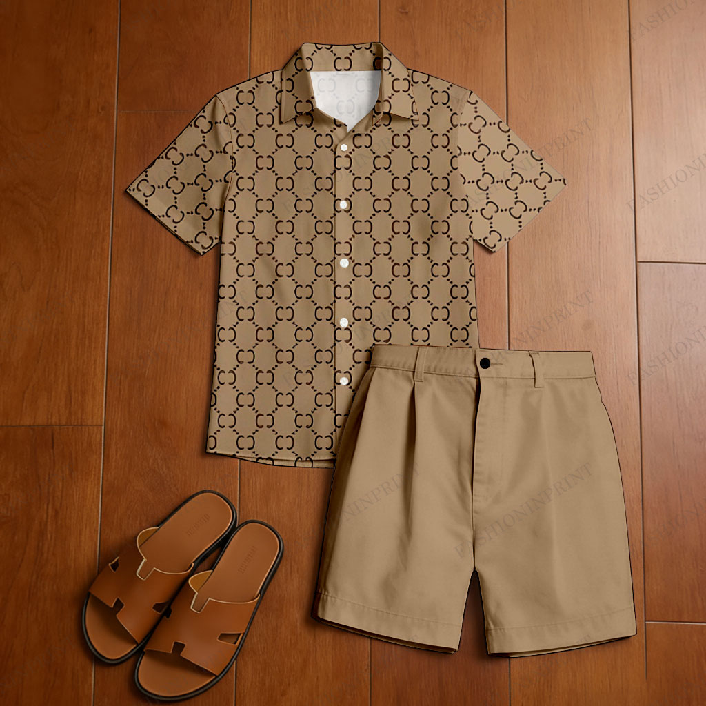 Men's Casual Khaki Checkered Retro Style Printed Short-Sleeve Shirt And Shorts Two-Piece Set
