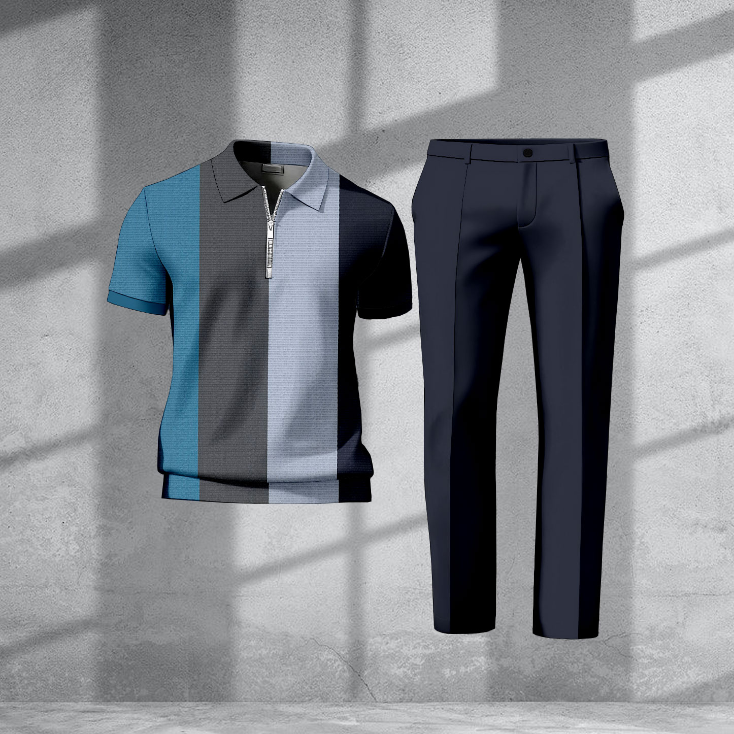 Men's Casual Navy Blue & Blue Color Matching Printed Short Sleeved Zipper Polo Shirt & Trousers Two-Piece Set