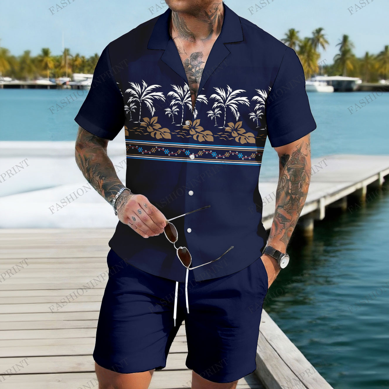Men's Casual Navy Blue Color Matching Hawaii Print Short-Sleeve Shirt & Shorts Two-Piece Set