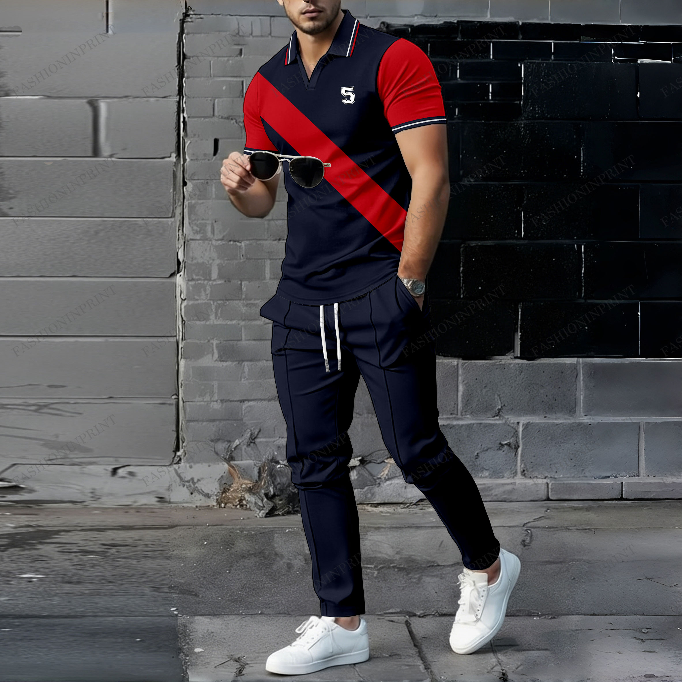 Men's Casual Navy Blue & Red Color Matching Geometric Printed Short Sleeved Polo Shirt & Trousers Two-Piece Set