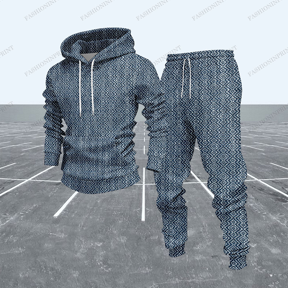 Men's Casual Navy Blue & White Color Matching Striped Pattern Hoodies Long Sleeved Sweatshirts & Sweatpants Two-Piece Set