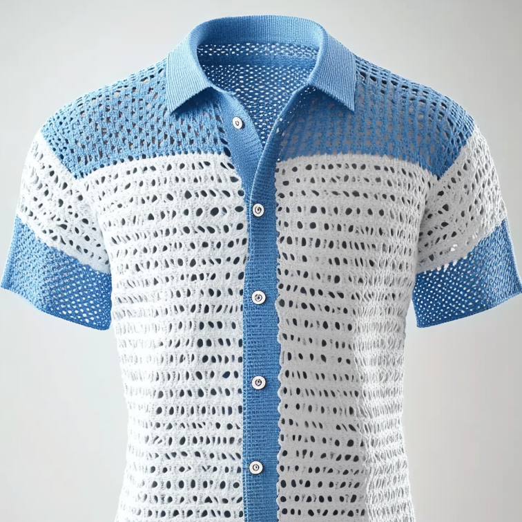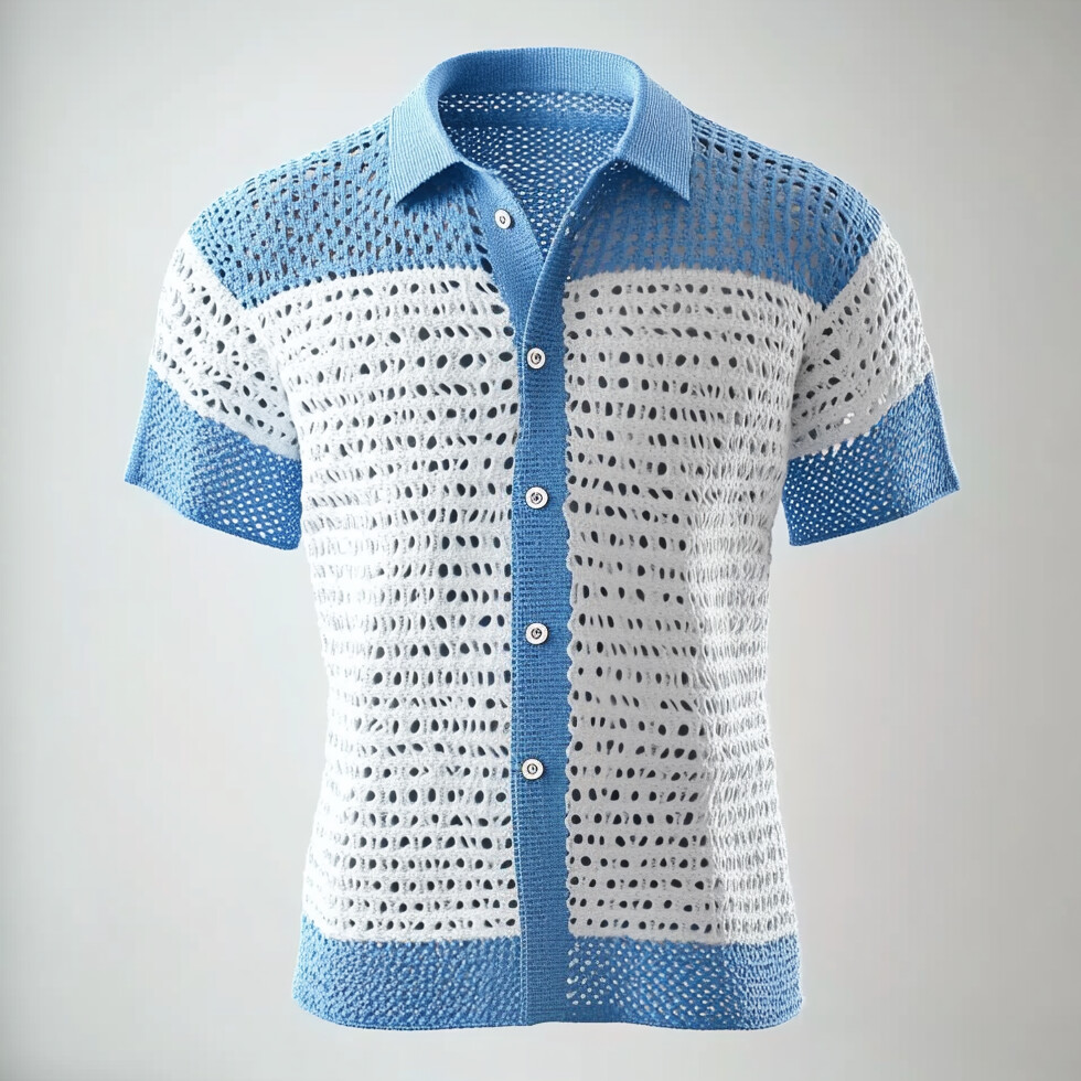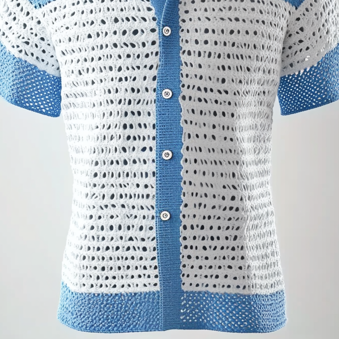 Men's Color Blocks Hollow Out Knit Button Short Sleeve Shirt
