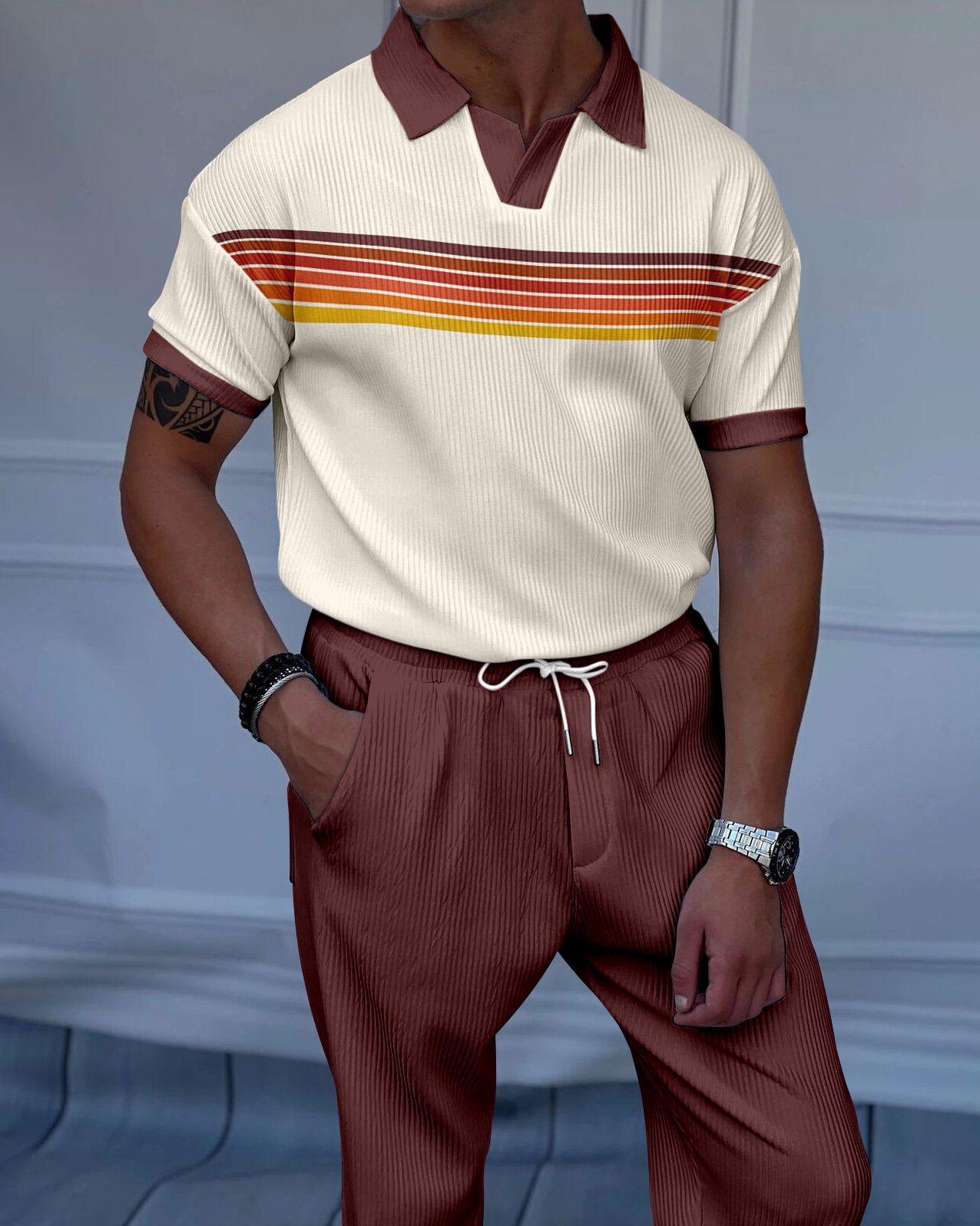 Men's Colorblock Casual Textured Polo Short Sleeve Suit - 004