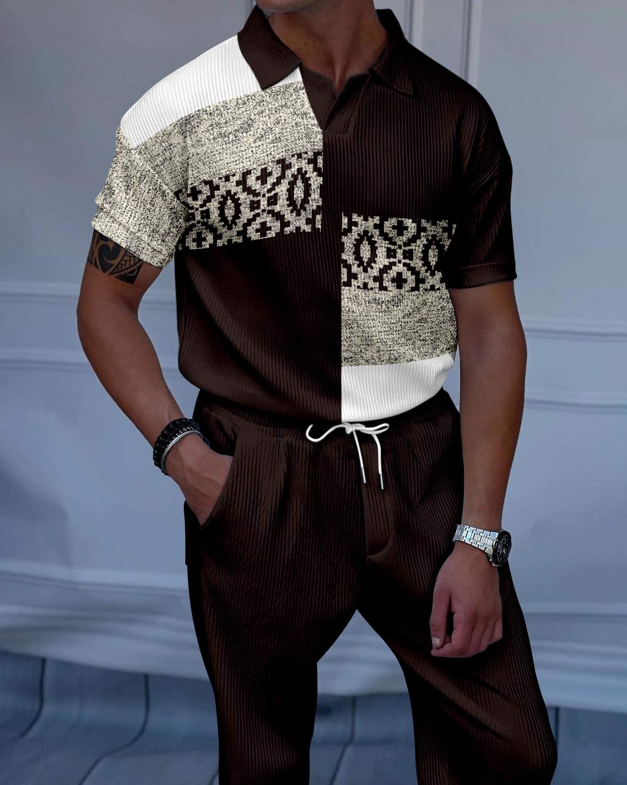 Men's Colorblock Casual Textured Polo Short Sleeve Suit - 010