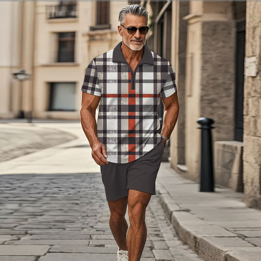 Men's Fashion Casual Zipper Polo Collar Geometric Printed Short-Sleeved Two-Piece Set