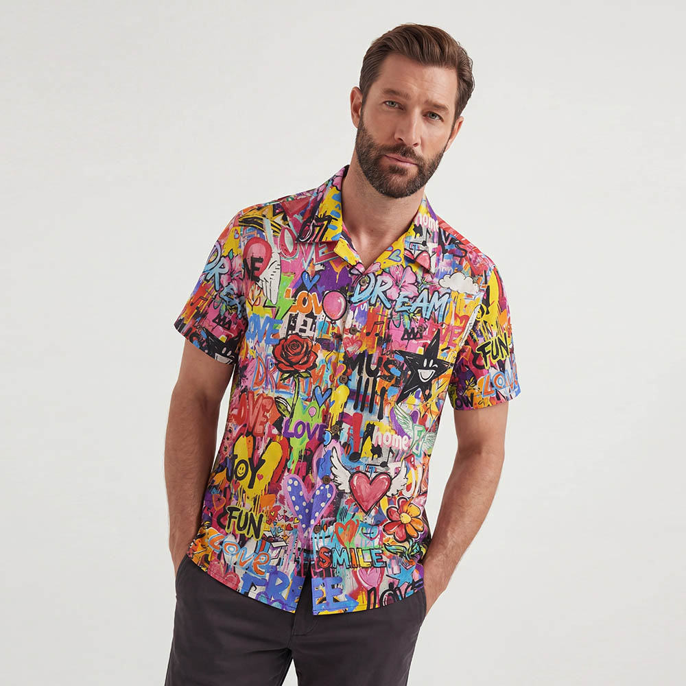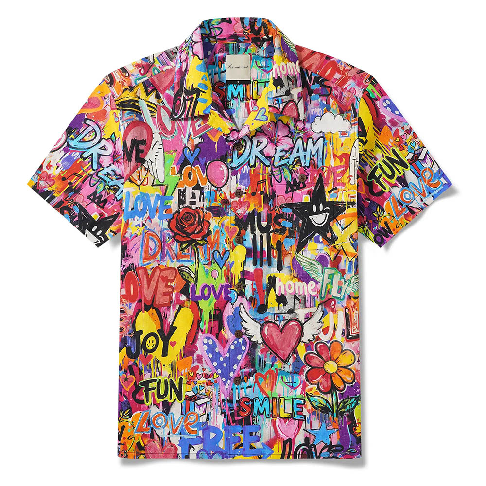 Men's Hawaiian Shirt Short Sleeve Camp Collar 100% Cotton Aloha Artistic Love Graffiti Fun