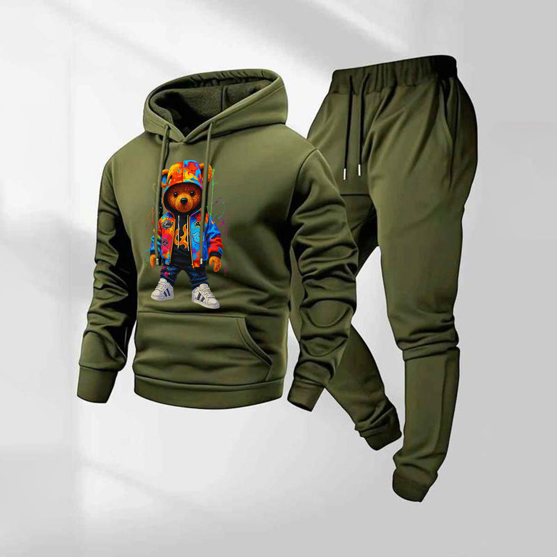 Men's Ink Splatter Cartoon Bear Patterned Hoodie And Drawstring Track Pants Set, Men's Casual Athletic Long-Sleeved Hooded Jacket And Pants, Suitable For Fall And Winter, Street Style Hoodie Set, Indoor And Outdoor Sportswear,