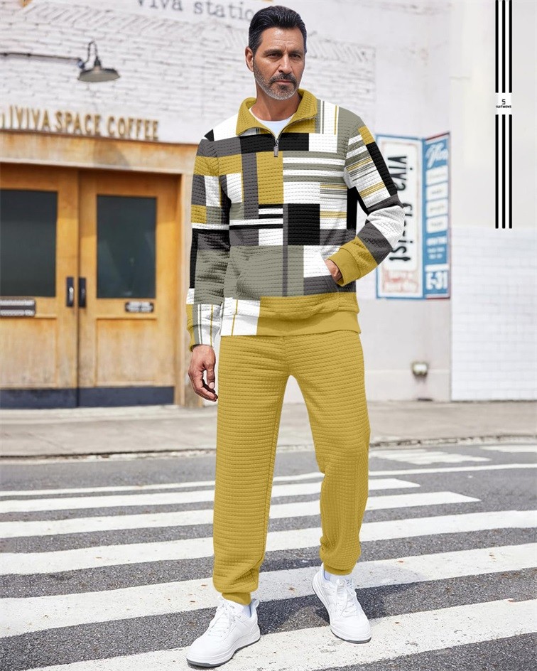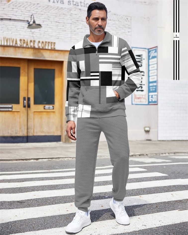 Men's Quarter Zipper Checked Jacquard Jogging Set 025