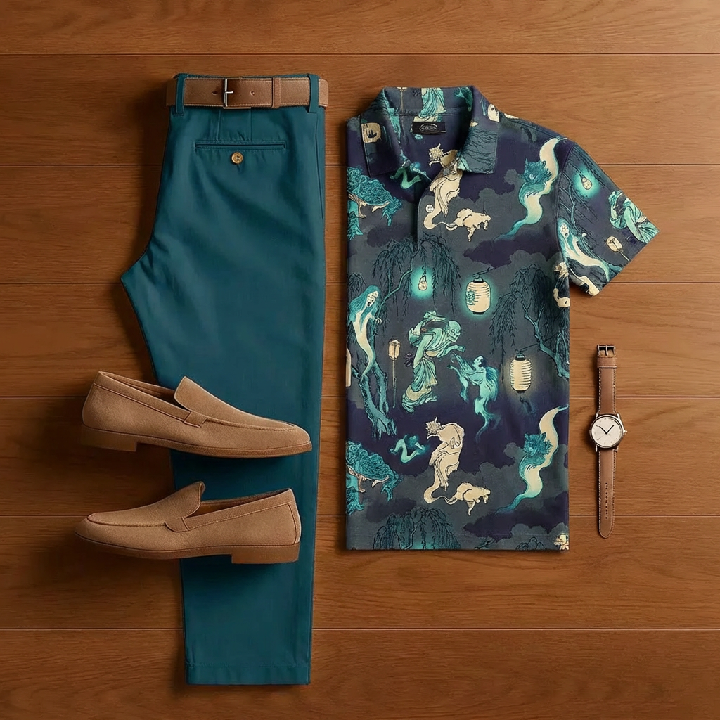 Men's Retro Royal Green Printed Short-Sleeve Shirt And Trousers Two-Piece Set