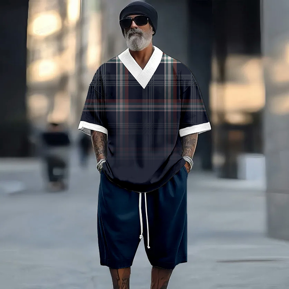 Men's Styles Casual Checked Printed Patchwork V-Neck Short-Sleeved Two-Piece Set