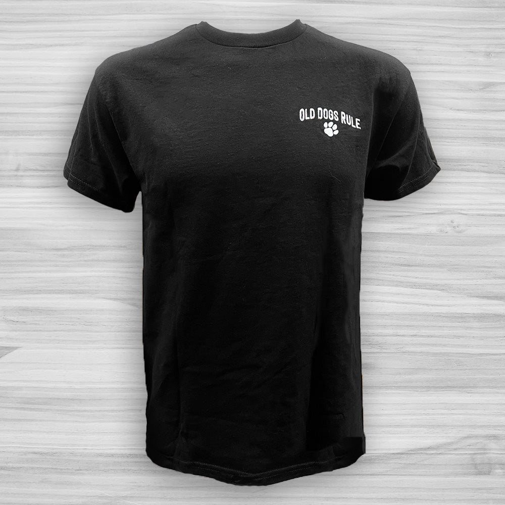 | Front Design: Mini "Old Dogs Rule" design on left chest |
